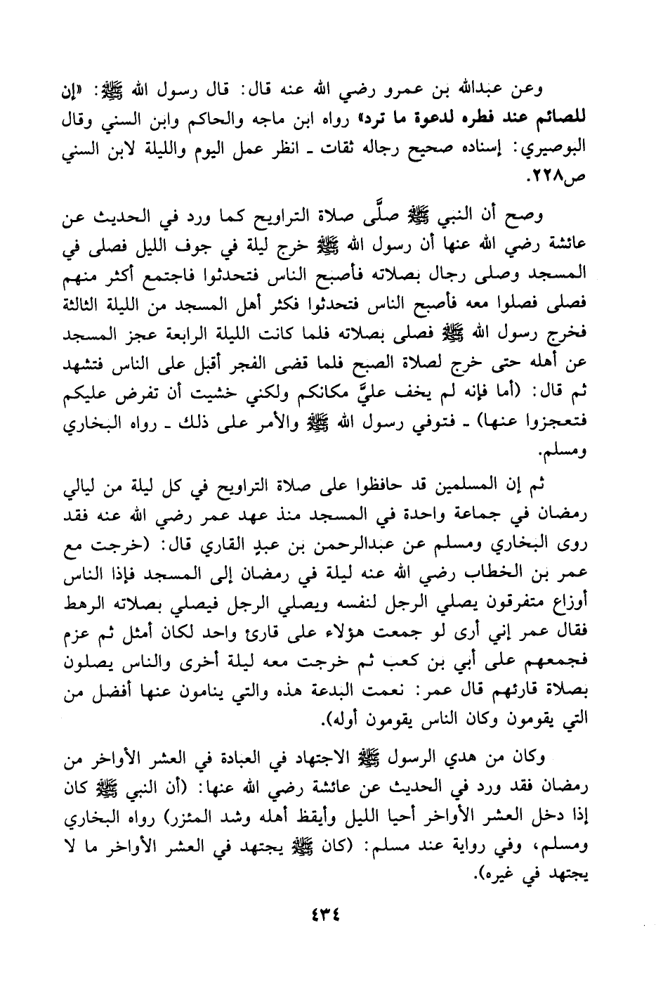 وصح أن النبي - صَلَّى اللهُ عَلَيْهِ وَسَلَّمَ - صلَّى صلاة التراويح كما ورد في الحديث عن عائشة رضي الله عنها أن رسول الله - صَلَّى اللهُ عَلَيْهِ وَسَلَّمَ - خرج ليلة في جوف الليل فصلى في المسجد وصلى رجال بصلاته فأصبح الناس فتحدثوا فاجتمع أكثر منهم فصلى فصلوا معه فأصبح الناس فتحدثوا فكثر أهل المسجد من الليلة الثالثة فخرج رسول الله - صَلَّى اللهُ عَلَيْهِ وَسَلَّمَ - فصلى بصلاته فلما كانت الليلة الرابعة عجز المسجد عن أهله حتى خرج لصلاة الصبح فلما قضى الفجر أقبل على الناس فتشهد ثم قال: (أما فإنه لم يخف عليَّ مكانكم ولكني خشيت أن تفرض عليكم فتعجزوا عنها) فتوفي رسول الله - صَلَّى اللهُ عَلَيْهِ وَسَلَّمَ - والأمر على ذلك). رواه البخاري ومسلم .......