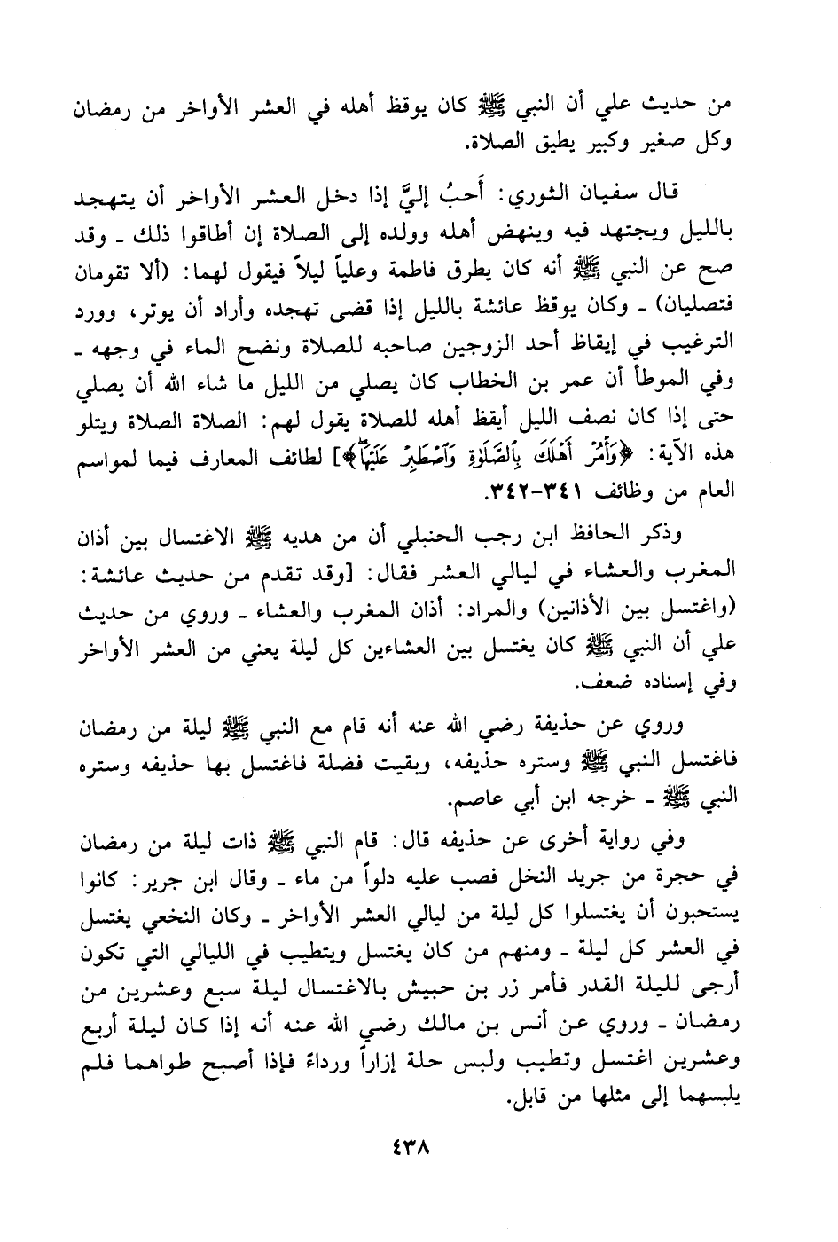 وفي رواية أخرى عن حذيفه قال: قام النبي - صَلَّى اللهُ عَلَيْهِ وَسَلَّمَ - ذات ليلة من رمضان في حجرة من جريد النخل فصب عليه دلواً من ماء. وقال ابن جرير: كانوا يستحبون أن يغتسلوا كل ليلة من ليالي العشر الأواخر. وكان النخعي يغتسل في العشر كل ليلة. ومنهم من كان يغتسل ويتطيب في الليالي التي تكون أرجى لليلة القدر فأمر زر بن حبيش بالاغتسال ليلة سبع وعشرين من رمضان. وروي عن أنس بن مالك - رضي الله عنه - أنه إذا كان ليلة أربع وعشرين اغتسل وتطيب ولبس حلة إزاراً ورداءً فإذا أصبح طواهما فلم يلبسهما إلى مثلها من قابل.