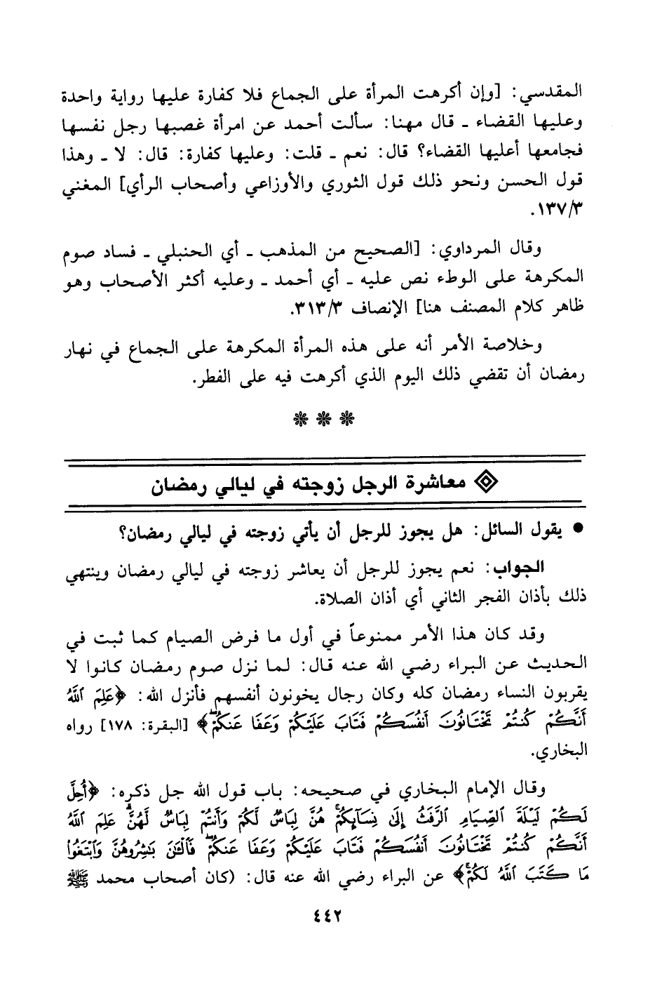 وقال الإمام البخاري في صحيحه: باب قول الله جل ذكره: (أُحِلَّ لَكُمْ لَيْلَةَ الصِّيَامِ الرَّفَثُ إِلَى نِسَائِكُمْ هُنَّ لِبَاسٌ لَكُمْ وَأَنْتُمْ لِبَاسٌ لَهُنَّ عَلِمَ اللَّهُ أَنَّكُمْ كُنْتُمْ تَخْتَانُونَ أَنْفُسَكُمْ فَتَابَ عَلَيْكُمْ وَعَفَا عَنْكُمْ فَالْآنَ بَاشِرُوهُنَّ وَابْتَغُوا مَا كَتَبَ اللَّهُ لَكُمْ) عن البراء - رضي الله عنه - قال: (كان أصحاب محمد - صَلَّى اللهُ عَلَيْهِ وَسَلَّمَ -