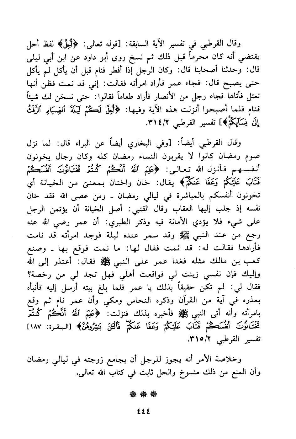 وقال القرطبي في تفسير الآية السابقة: [قوله تعالى " أحل " لفظ أحل يقتضي أنه كان محرماً قبل ذلك ثم نسخ روى أبو داود عن ابن أبي ليلى قال: وحدثنا أصحابنا قال: وكان الرجل إذا أفطر فنام قبل أن يأكل لم يأكل حتى يصبح قال: فجاء عمر فأراد امرأته فقالت: إني قد نمت فظن أنها تعتل فأتاها فجاء رجل من الأنصار فأراد طعاماً فقالوا: حتى نسخن لك شيئاً فنام فلما أصبحوا أنزلت هذه الآية وفيها: (أُحِلَّ لَكُمْ لَيْلَةَ الصِّيَامِ الرَّفَثُ إِلَى نِسَائِكُمْ)] تفسير القرطبي 2/ 314.