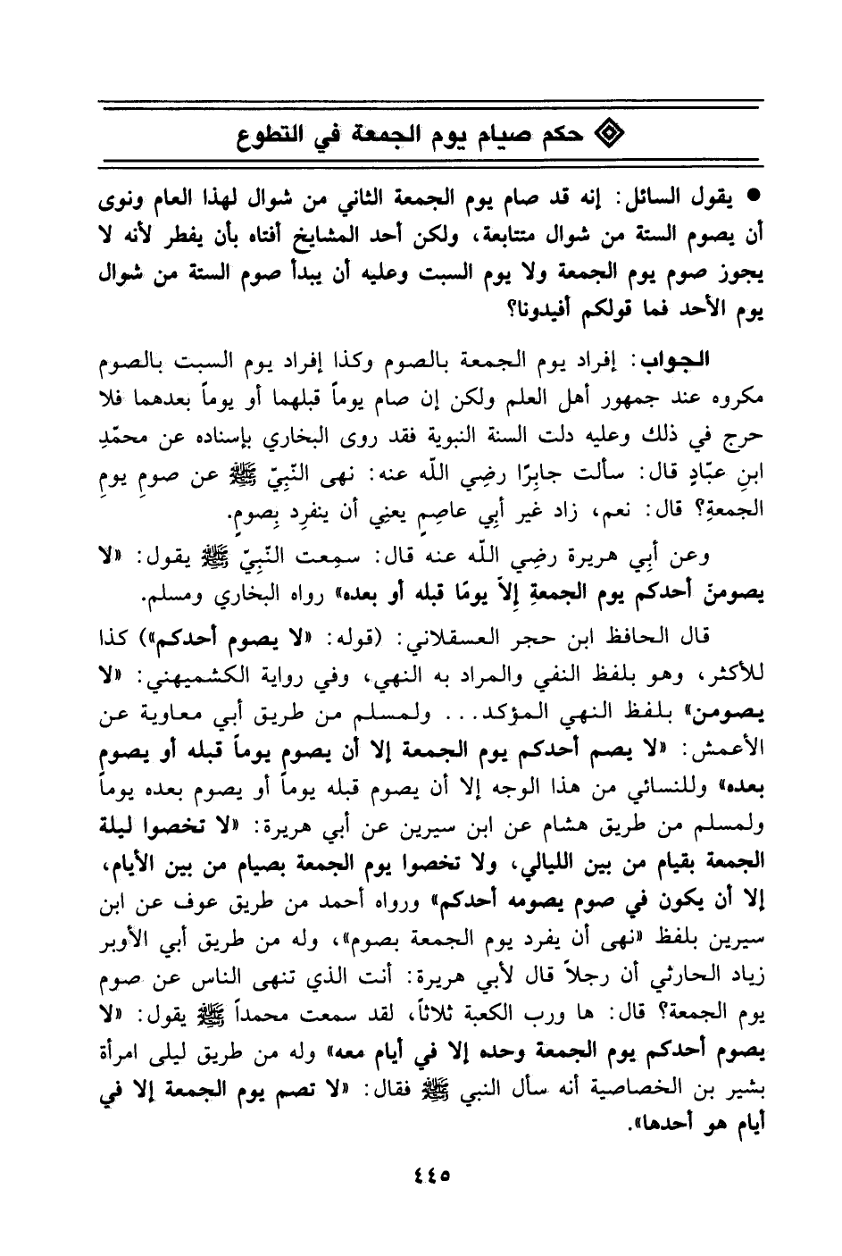 الجواب: إفراد يوم الجمعة بالصوم وكذا إفراد يوم السبت بالصوم مكروه عند جمهور أهل العلم ولكن إن صام يوماً قبلهما أو يوماً بعدهما فلا حرج في ذلك وعليه دلت السنة النبوية فقد روى البخاري بإسناده عَنْ مُحَمَّدِ بْنِ عَبَّادٍ قَالَ سَأَلْتُ جَابِرًا رَضِيَ اللَّهُ عَنْهُ نَهَى النَّبِيُّ - صَلَّى اللهُ عَلَيْهِ وَسَلَّمَ - عَنْ صَوْمِ يَوْمِ الْجُمُعَةِ قَالَ نَعَمْ زَادَ غَيْرُ أَبِي عَاصِمٍ يَعْنِي أَنْ يَنْفَرِدَ بِصَوْمٍ.
