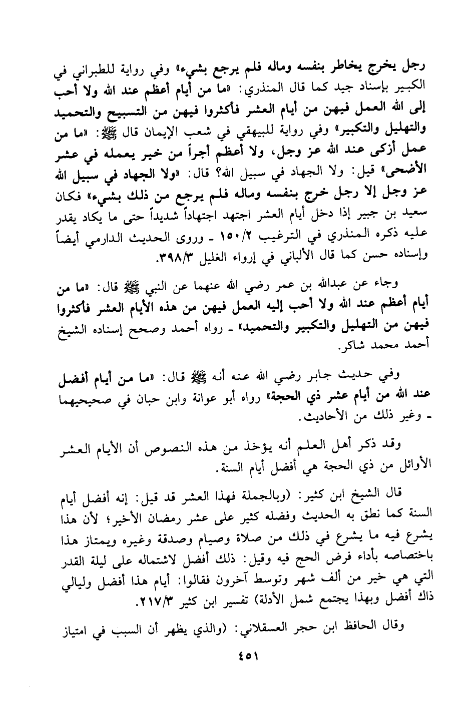 رجل يخرج يخاطر بنفسه وماله فلم يرجع بشيء) وفي رواية للطبراني في الكبير بإسناد جيد كما قال المنذري: (ما من أيام أعظم عند الله ولا أحب إلى الله العمل فيهن من أيام العشر فأكثروا فيهن من التسبيح والتحميد والتهليل والتكبير) وفي رواية للبيهقي في شعب الإيمان قال - صَلَّى اللهُ عَلَيْهِ وَسَلَّمَ -: (ما من عمل أزكى عند الله عز وجل، ولا أعظم أجراً من خير يعمله في عشر الأضحى) قيل: ولا الجهاد في سبيل الله؟ قال: (ولا الجهاد في سبيل الله عز وجل إلا رجل خرج بنفسه وماله فلم يرجع من ذلك بشيء) فكان سعيد بن جبير إذا دخل أيام العشر اجتهد اجتهاداً شديداً حتى ما يكاد يقدر عليه ذكره المنذري في الترغيب 2/ 150. وروى الحديث الدارمي أيضاً وإسناده حسن كما قال الألباني في إرواء الغليل 3/ 398.