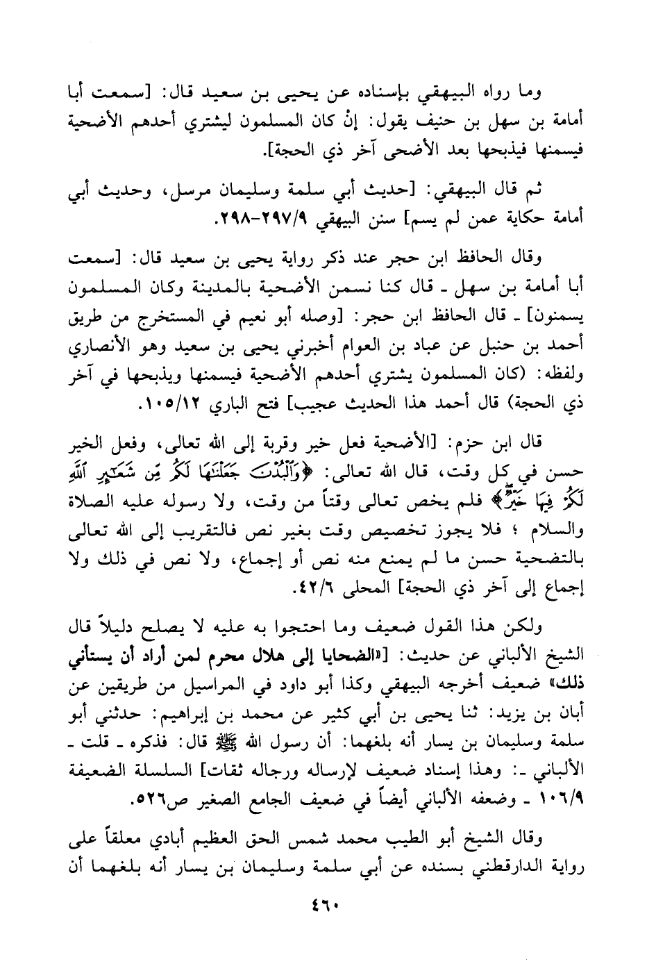 وقال الحافظ ابن حجر عند ذكر رواية يحيى بن سعيد قال: [سمعت أبا أمامة بن سهل. قال كنا نسمن الأضحية بالمدينة وكان المسلمون يسمنون]. قال الحافظ ابن حجر: [وصله أبو نعيم في المستخرج من طريق أحمد بن حنبل عن عباد بن العوام أخبرني يحيى بن سعيد وهو الأنصاري ولفظه: (كان المسلمون يشتري أحدهم الأضحية فيسمنها ويذبحها في آخر ذي الحجة) قال أحمد هذا الحديث عجيب] فتح الباري 12/ 105.
