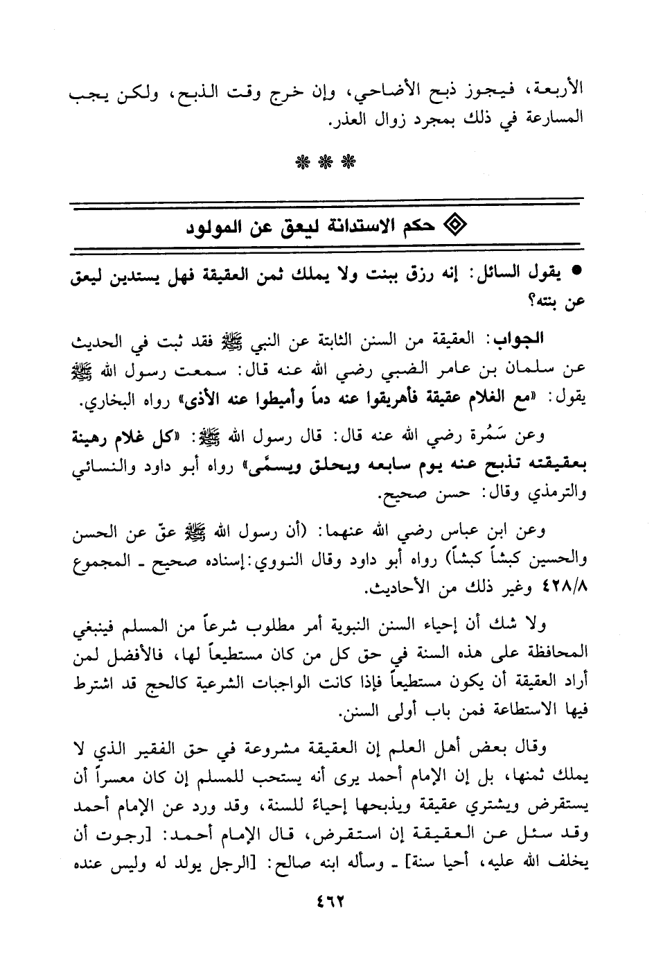 وقال بعض أهل العلم إن العقيقة مشروعة في حق الفقير الذي لا يملك ثمنها، بل إن الإمام أحمد يرى أنه يستحب للمسلم إن كان معسراً أن يستقرض ويشتري عقيقة ويذبحها إحياءً للسنة، وقد ورد عن الإمام أحمد وقد سئل عن العقيقة إن استقرض، قال الإمام أحمد: [رجوت أن يخلف الله عليه، أحيا سنة]. وسأله ابنه صالح: [الرجل يولد له وليس عنده