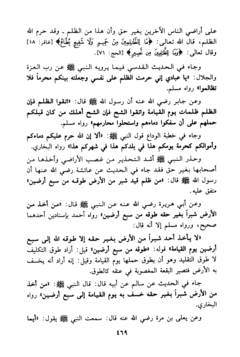 وعن أبي هريرة - رضي الله عنه - عن النبي - صَلَّى اللهُ عَلَيْهِ وَسَلَّمَ - قال: (من أخذ من الأرض شبراً بغير حقه طوقه من سبع أرضين) رواه أحمد بإسنادين أحدهما صحيح، ورواه مسلم إلا أنه قال: