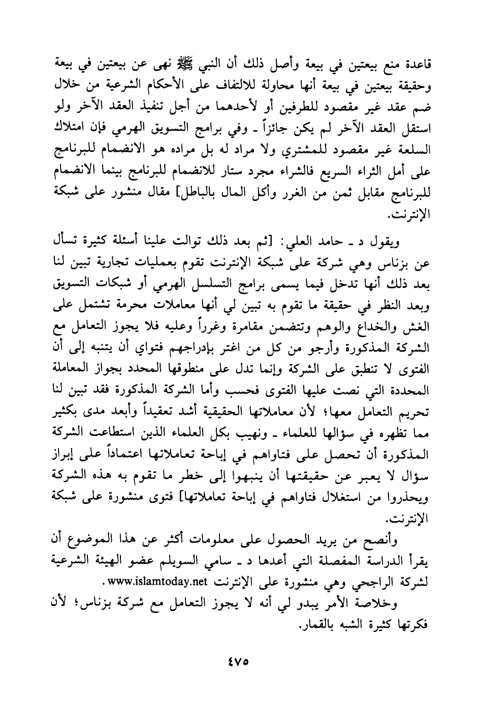 قاعدة منع بيعتين في بيعة وأصل ذلك أن النبي - صَلَّى اللهُ عَلَيْهِ وَسَلَّمَ - نهى عن بيعتين في بيعة وحقيقة بيعتين في بيعة أنها محاولة للالتفاف على الأحكام الشرعية من خلال ضم عقد غير مقصود للطرفين أو لأحدهما من أجل تنفيذ العقد الآخر ولو استقل العقد الآخر لم يكن جائزاً. وفي برامج التسويق الهرمي فإن امتلاك السلعة غير مقصود للمشتري ولا مراد له بل مراده هو الانضمام للبرنامج على أمل الثراء السريع فالشراء مجرد ستار للانضمام للبرنامج بينما الانضمام للبرنامج مقابل ثمن من الغرر وأكل المال بالباطل] مقال منشور على شبكة الإنترنت .......