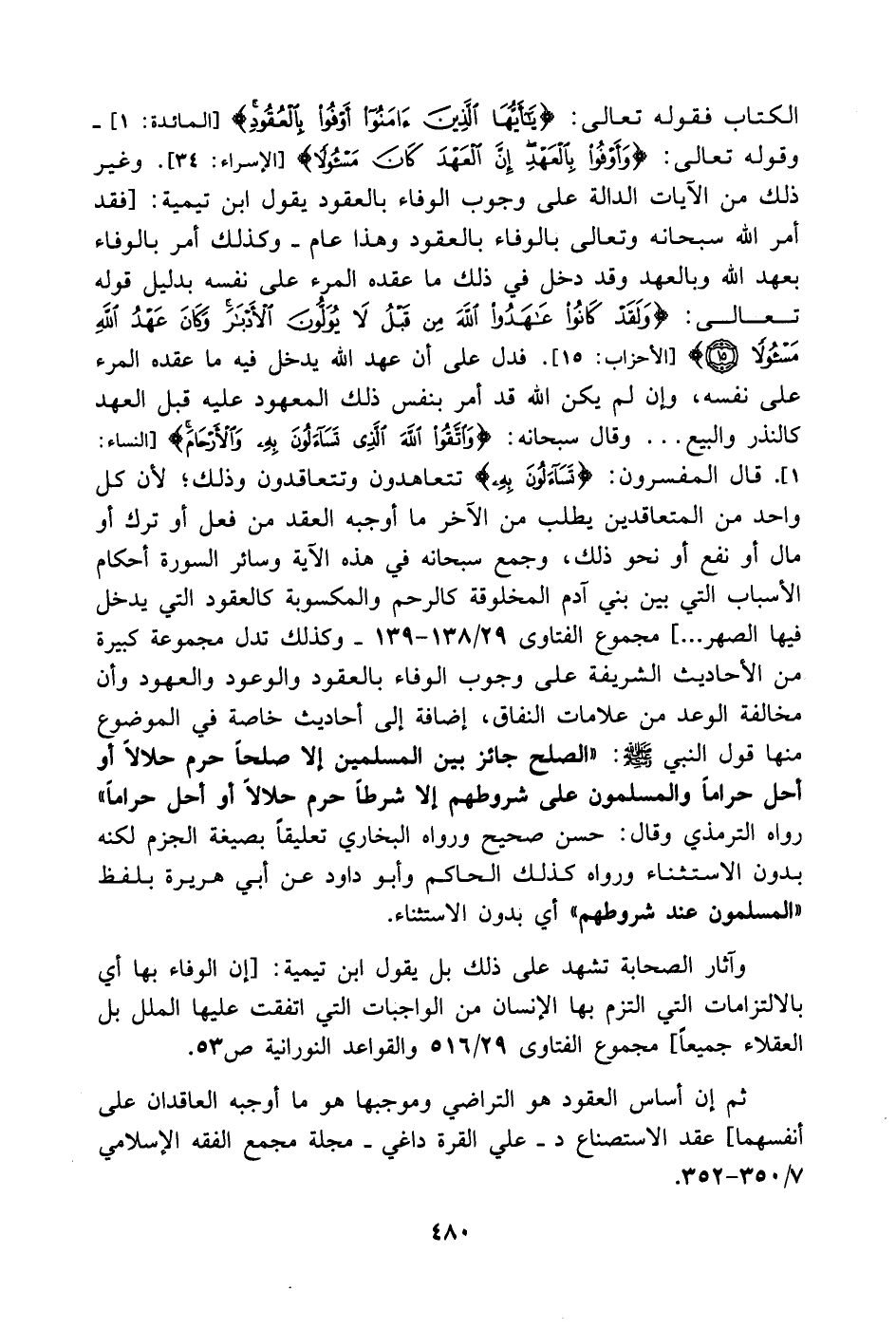 وآثار الصحابة تشهد على ذلك بل يقول ابن تيمية: [إن الوفاء بها أي بالالتزامات التي التزم بها الإنسان من الواجبات التي اتفقت عليها الملل بل العقلاء جميعاً] مجموع الفتاوى 29/ 516 والقواعد النورانية ص53.