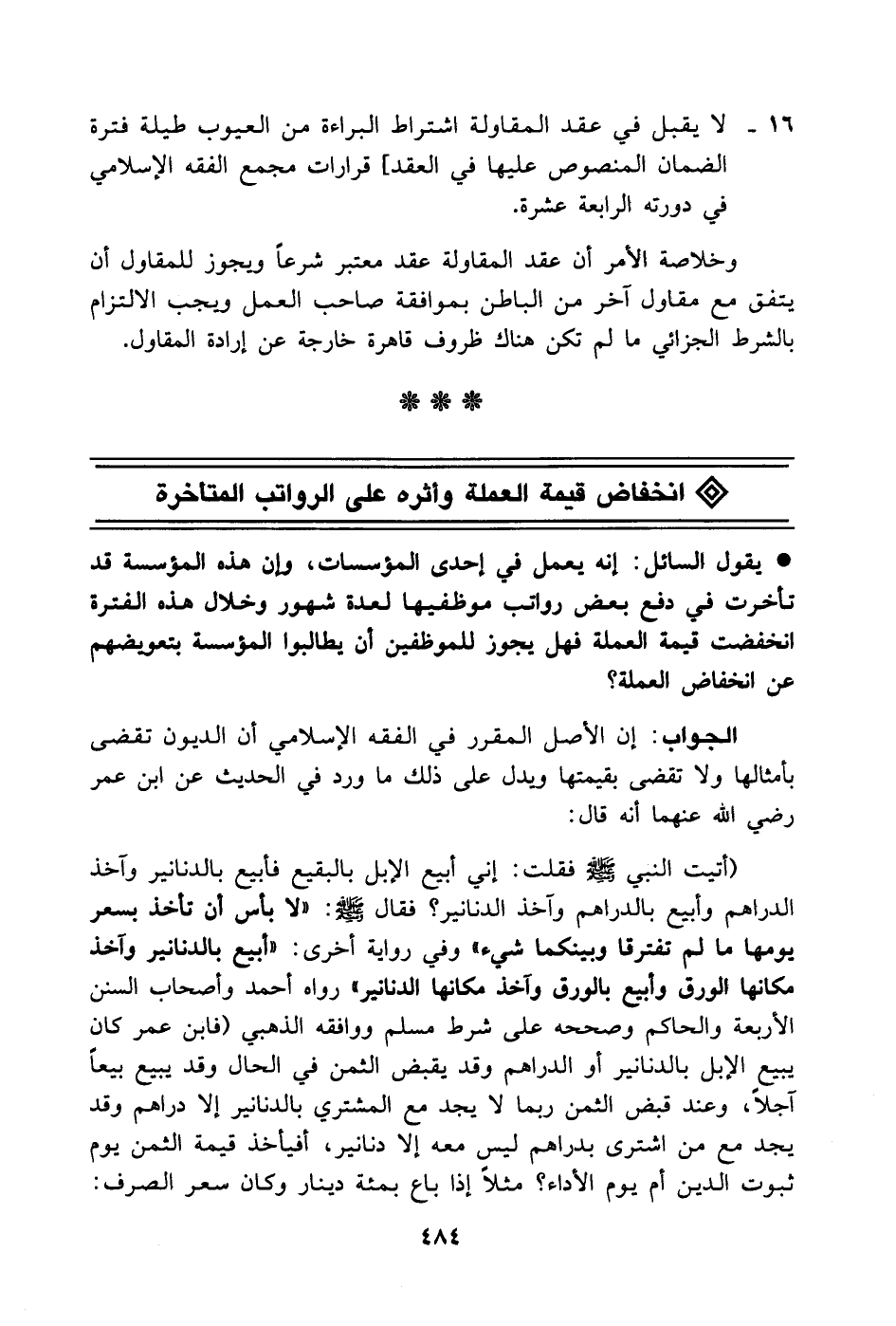 (أتيت النبي - صَلَّى اللهُ عَلَيْهِ وَسَلَّمَ - فقلت: إني أبيع الإبل بالبقيع فأبيع بالدنانير وآخذ الدراهم وأبيع بالدراهم وآخذ الدنانير؟ فقال - صَلَّى اللهُ عَلَيْهِ وَسَلَّمَ -: لا بأس أن تأخذ بسعر يومها ما لم تفترقا وبينكما شيء) وفي رواية أخرى: (أبيع بالدنانير وآخذ مكانها الورق وأبيع بالورق وآخذ مكانها الدنانير) رواه أحمد وأصحاب السنن الأربعة والحاكم وصححه على شرط مسلم ووافقه الذهبي (فابن عمر كان يبيع الإبل بالدنانير أو الدراهم وقد يقبض الثمن في الحال وقد يبيع بيعاً آجلاً وعند قبض الثمن ربما لا يجد مع المشتري بالدنانير إلا دراهم وقد يجد مع من اشترى بدراهم ليس معه إلا دنانير أفيأخذ قيمة الثمن يوم ثبوت الدين أم يوم الأداء؟ مثلاً إذا باع بمئة دينار وكان سعر الصرف: