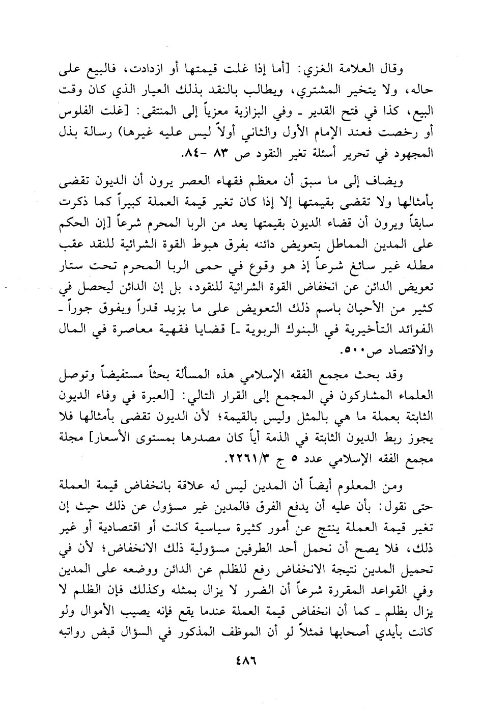 ويضاف إلى ما سبق أن معظم فقهاء العصر يرون أن الديون تقضى بأمثالها ولا تقضى بقيمتها إلا إذا كان تغير قيمة العملة كبيراً كما ذكرت سابقاً ويرون أن قضاء الديون بقيمتها يعد من الربا المحرم شرعاً [إن الحكم على المدين المماطل بتعويض دائنه بفرق هبوط القوة الشرائية للنقد عقب مطله غير سائغ شرعاً إذ هو وقوع في حمى الربا المحرم تحت ستار تعويض الدائن عن انخفاض القوة الشرائية للنقود، بل إن الدائن ليحصل في كثير من الأحيان باسم ذلك التعويض على ما يزيد قدراً ويفوق جوراً الفوائد التأخيرية في البنوك الربوية] قضايا فقهية معاصرة في المال والاقتصاد ص500.