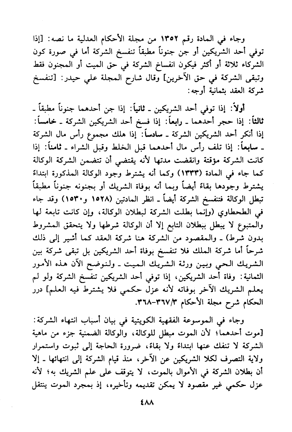 أولاً: إذا توفي أحد الشريكين. ثانياً: إذا جن أحدهما جنوناً مطبقاً. ثالثاً: إذا حجر أحدهما. رابعاً: إذا فسخ أحد الشريكين الشركة. خامساً: إذا أنكر أحد الشريكين الشركة. سادساً: إذا هلك مجموع رأس مال الشركة. سابعاً: إذا تلف رأس مال أحدهما قبل الخلط وقبل الشراء. ثامناً: إذا كانت الشركة مؤقتة وانقضت مدتها لأنه يقتضي أن تتضمن الشركة الوكالة كما جاء في المادة (1333) وكما أنه يشترط وجود الوكالة المذكورة ابتداءً يشترط وجودها بقاءً أيضاً وبما أنه بوفاة الشريك أو بجنونه جنوناً مطبقاً تبطل الوكالة فتنفسخ الشركة أيضاً. انظر المادتين (1528 و1530) وقد جاء في الطحطاوي (وإنما بطلت الشركة لبطلان الوكالة وإن كانت تابعة لها والمتبوع لا يبطل ببطلان التابع إلا أن الوكالة شرطها ولا يتحقق المشروط بدون شرط). والمقصود من الشركة هنا شركة العقد كما أشير إلى ذلك شرحاً أما شركة الملك فلا تنفسخ بوفاة أحد الشريكين بل تبقى شركة بين الشريك الحي وبين ورثة الشريك الميت. ولنوضح الآن هذه الأمور الثمانية: وفاة أحد الشريكين، إذا توفي أحد الشريكين تنفسخ الشركة ولو لم يعلم الشريك الآخر بوفاته لأنه عزل حكمي فلا يشترط فيه العلم] درر الحكام شرح مجلة الأحكام 3/ 367 - 368 .......