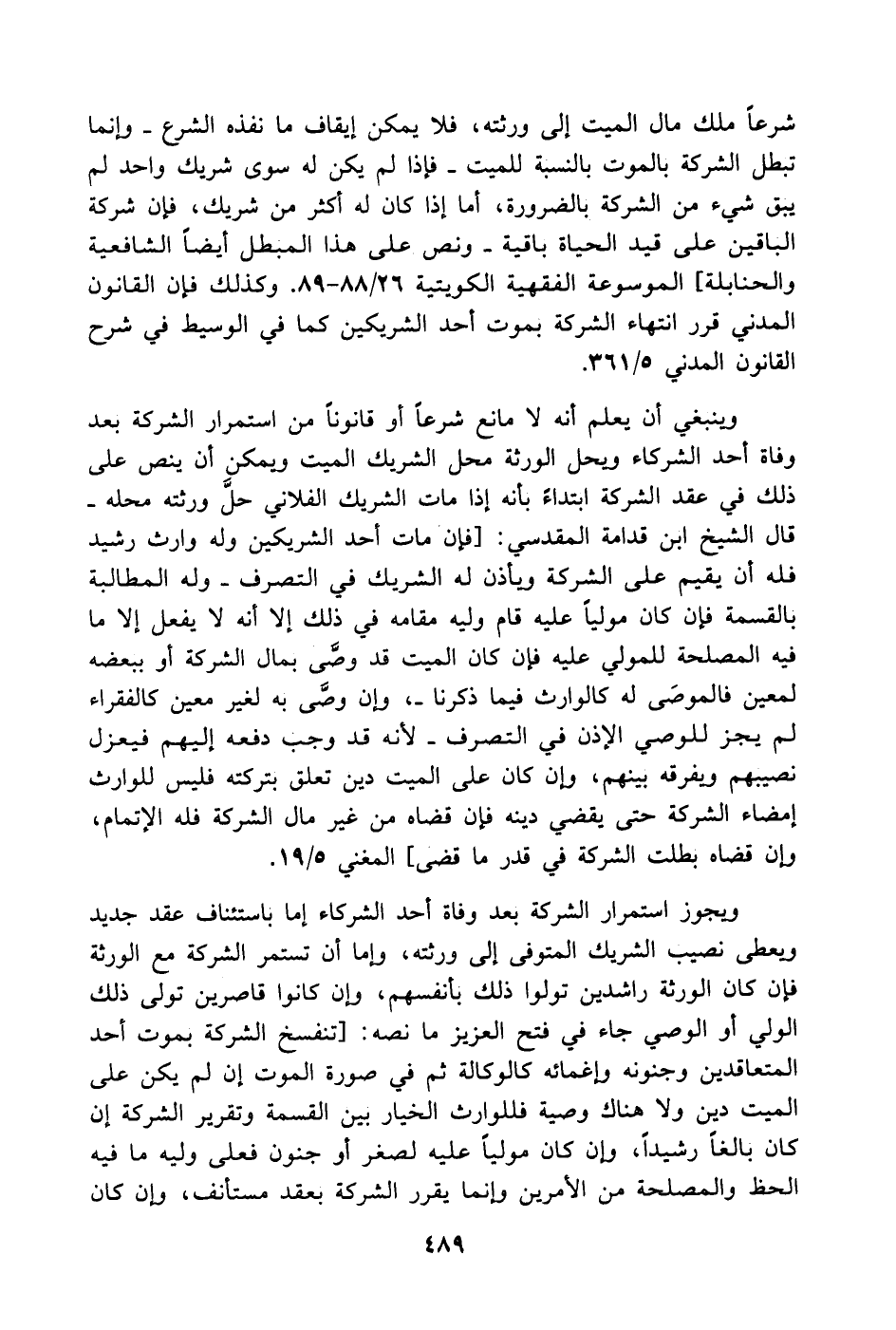 شرعاً ملك مال الميت إلى ورثته، فلا يمكن إيقاف ما نفذه الشرع. وإنما تبطل الشركة بالموت بالنسبة للميت. فإذا لم يكن له سوى شريك واحد لم يبق شيء من الشركة بالضرورة، أما إذا كان له أكثر من شريك، فإن شركة الباقين على قيد الحياة باقية. ونص على هذا المبطل أيضاً الشافعية والحنابلة] الموسوعة الفقهية الكويتية 26/ 88 - 89. وكذلك فإن القانون المدني قرر انتهاء الشركة بموت أحد الشريكين كما في الوسيط في شرح القانون المدني 5/ 361 .......