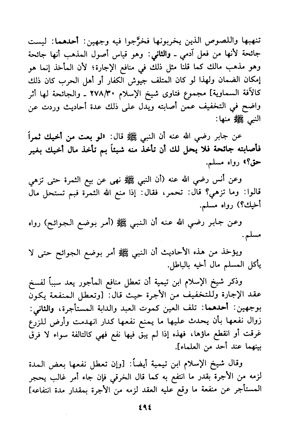 عن جابر - رضي الله عنه - أن النبي - صَلَّى اللهُ عَلَيْهِ وَسَلَّمَ - قال: (لو بعت من أخيك ثمراً فأصابته جائحة فلا يحل لك أن تأخذ منه شيئاً بم تأخذ مال أخيك بغير حق؟) رواه مسلم.