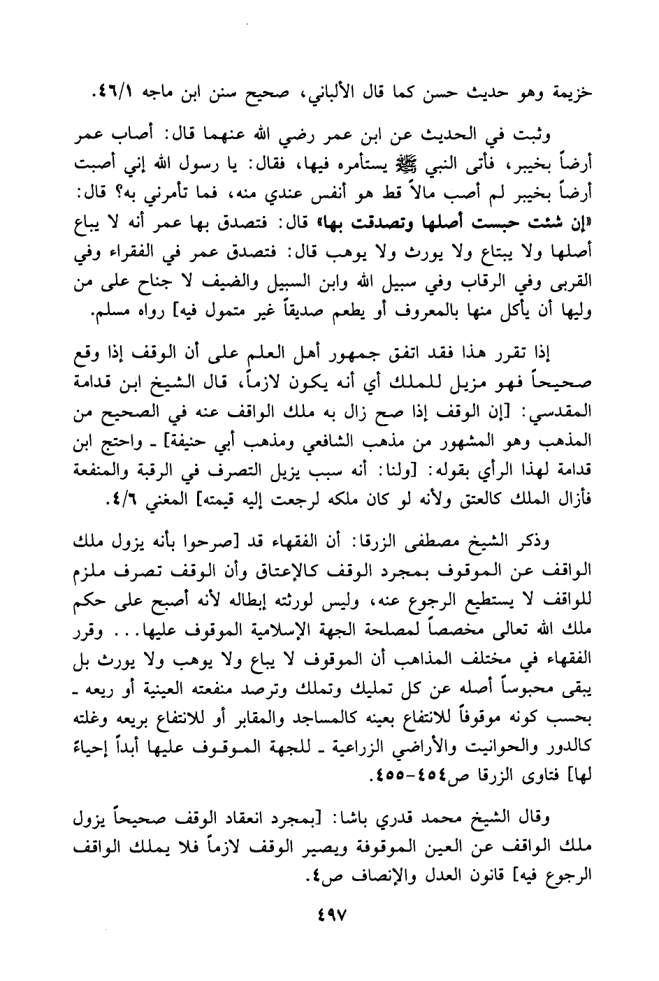 وقال الشيخ محمد قدري باشا: [بمجرد انعقاد الوقف صحيحاً يزول ملك الواقف عن العين الموقوفة ويصير الوقف لازماً فلا يملك الواقف الرجوع فيه] قانون العدل والإنصاف ص4.