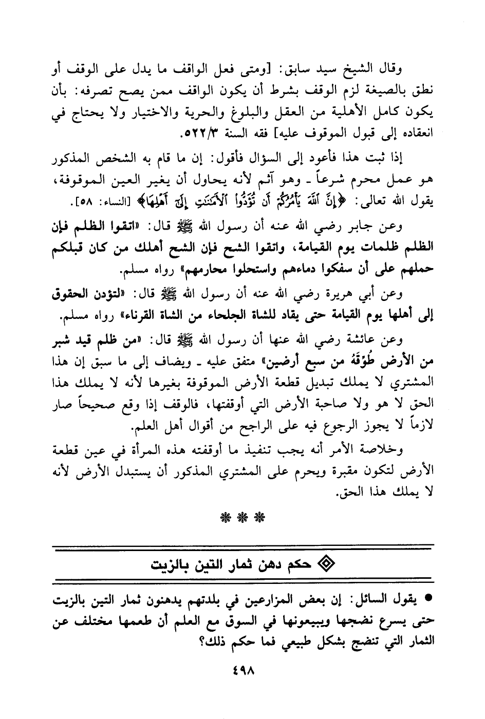 وعن عائشة رضي الله عنها أن رسول الله - صَلَّى اللهُ عَلَيْهِ وَسَلَّمَ - قال: (من ظلم قيد شبر من الأرض طُوِّقَهُ من سبع أرضين) متفق عليه. ويضاف إلى ما سبق إن هذا المشتري لا يملك تبديل قطعة الأرض الموقوفة بغيرها لأنه لا يملك هذا الحق لا هو ولا صاحبة الأرض التي أوقفتها فالوقف إذا وقع صحيحاً صار لازماً لا يجوز الرجوع فيه على الراجح من أقوال أهل العلم.