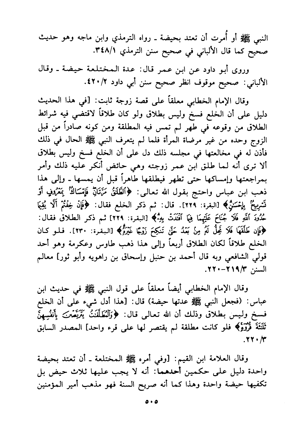 وقال العلامة ابن القيم: [وفي أمره - صَلَّى اللهُ عَلَيْهِ وَسَلَّمَ - المختلعة. أن تعتد بحيضة واحدة دليل على حكمين أحدهما: أنه لا يجب عليها ثلاث حيض بل تكفيها حيضة واحدة وهذا كما أنه صريح السنة فهو مذهب أمير المؤمنين