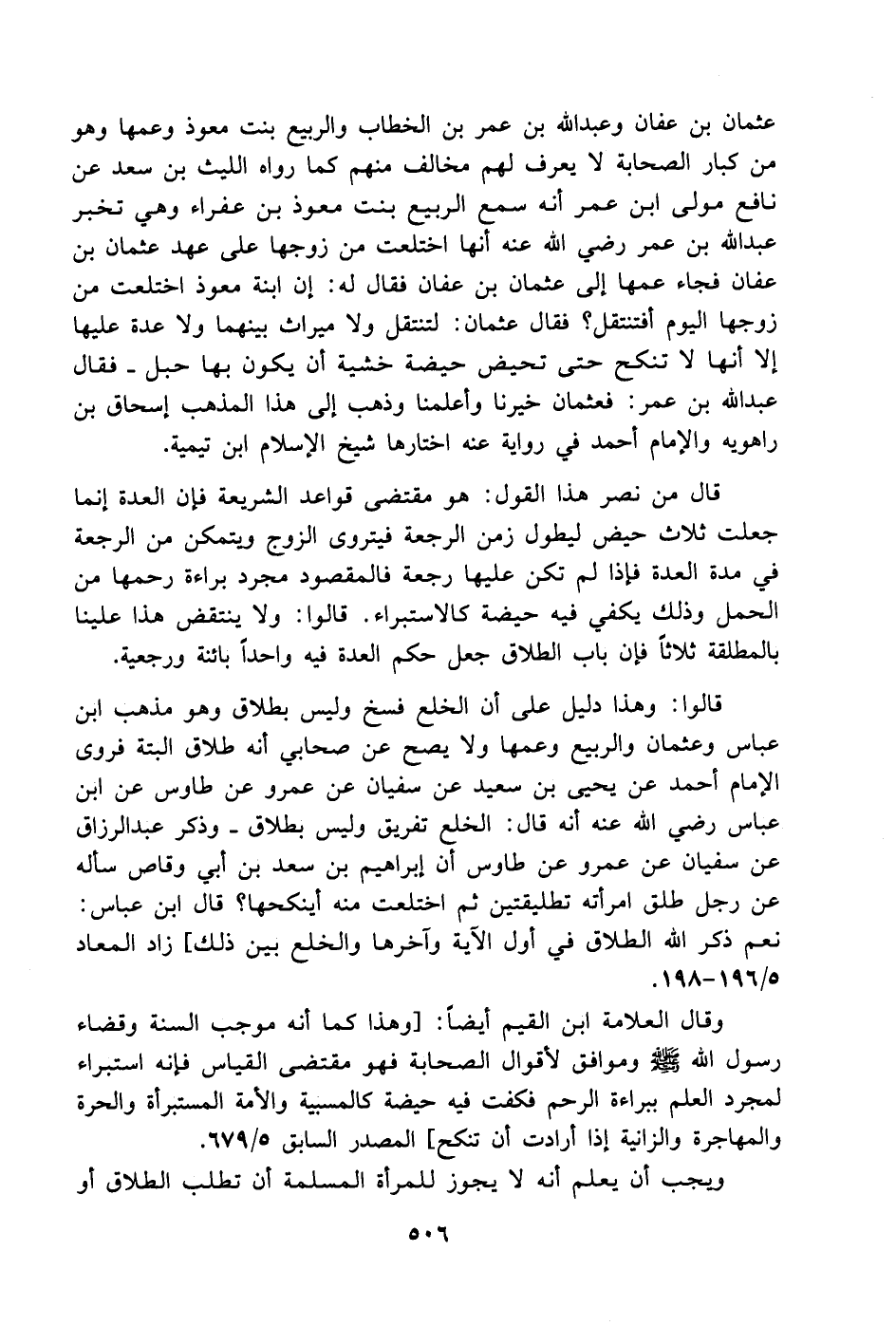 قالوا: وهذا دليل على أن الخلع فسخ وليس بطلاق وهو مذهب ابن عباس وعثمان والربيع وعمها ولا يصح عن صحابي أنه طلاق البتة فروى الإمام أحمد عن يحيى بن سعيد عن سفيان عن عمرو عن طاووس عن ابن عباس رضي الله عنه أنه قال: الخلع تفريق وليس بطلاق. وذكر عبد الرزاق عن سفيان عن عمرو عن طاووس أن إبراهيم بن سعد بن أبي وقاص سأله عن رجل طلق امرأته تطليقتين ثم اختلعت منه أينكحها؟ قال ابن عباس: نعم ذكر الله الطلاق في أول الآية وآخرها والخلع بين ذلك] زاد المعاد 5/ 196 - 198 .......