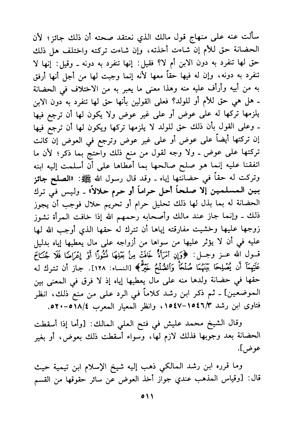 وَالصُّلْحُ خَيْرٌ) سورة النساء الآية 128. جاز أن تترك له حقها في حضانة ولدها منه على مال يعطيها إياه إذ لا فرق في المعنى بين الموضعين]. ثم ذكر ابن رشد كلاماً في الرد على من منع ذلك انظر فتاوى ابن رشد 3/ 1546 - 1547 وانظر المعيار المعرب 4/ 518 - 520.