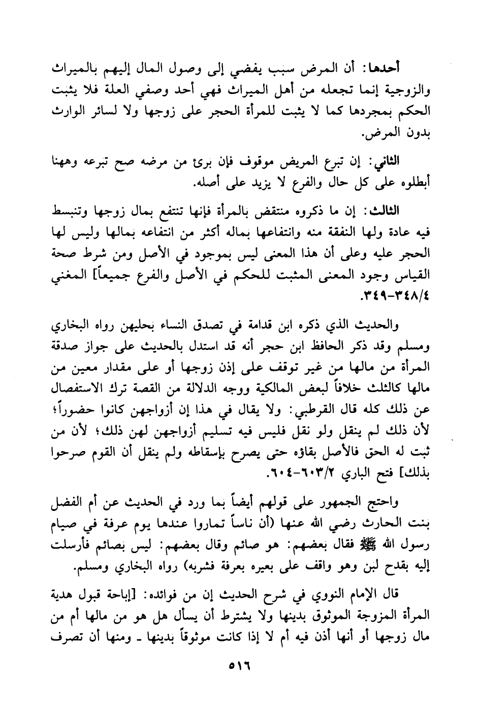 والحديث الذي ذكره ابن قدامة في تصدق النساء بحليهن رواه البخاري ومسلم وقد ذكر الحافظ ابن حجر أنه قد استدل بالحديث على جواز صدقة المرأة من مالها من غير توقف على إذن زوجها أو على مقدار معين من مالها كالثلث خلافاً لبعض المالكية ووجه الدلالة من القصة ترك الاستفصال عن ذلك كله قال القرطبي: ولا يقال في هذا إن أزواجهن كانوا حضوراً لأن ذلك لم ينقل ولو نقل فليس فيه تسليم أزواجهن لهن ذلك لأن من ثبت له الحق فالأصل بقاؤه حتى يصرح بإسقاطه ولم ينقل أن القوم صرحوا بذلك] فتح الباري 2/ 603 - 604.