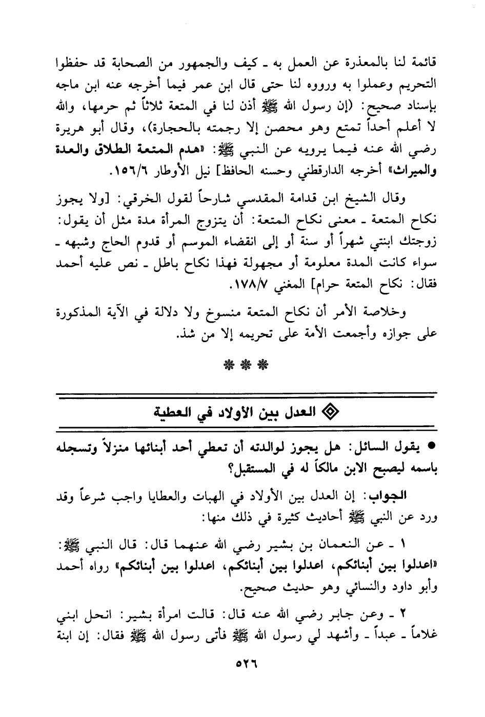 قائمة لنا بالمعذرة عن العمل به. كيف والجمهور من الصحابة قد حفظوا التحريم وعملوا به ورووه لنا حتى قال ابن عمر فيما أخرجه عنه ابن ماجة بإسناد صحيح (إن رسول الله - صَلَّى اللهُ عَلَيْهِ وَسَلَّمَ - أذن لنا في المتعة ثلاثاً ثم حرمها والله لا أعلم أحداً تمتع وهو محصن إلا رجمته بالحجارة) وقال أبو هريرة - رضي الله عنه - فيما يرويه عن النبي - صَلَّى اللهُ عَلَيْهِ وَسَلَّمَ -: (هدم المتعة الطلاق والعدة والميراث) أخرجه الدارقطني وحسنه الحافظ] نيل الأوطار 6/ 156.