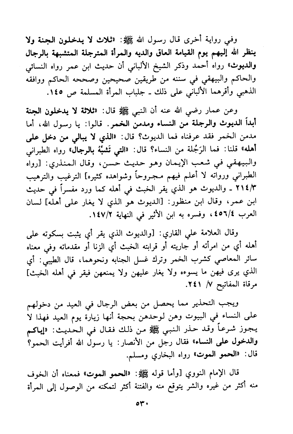 وفي رواية أخرى قال رسول الله - صَلَّى اللهُ عَلَيْهِ وَسَلَّمَ -: (ثلاث لا يدخلون الجنة ولا ينظر الله إليهم يوم القيامة العاق والديه والمرأة المترجلة المتشبهة بالرجال والديوث) رواه أحمد وذكر الشيخ الألباني أن حديث ابن عمر رواه النسائي والحاكم والبيهقي في سننه من طريقين صحيحين وصححه الحاكم ووافقه الذهبي وأقرهما الألباني على ذلك. جلباب المرأة المسلمة ص 145 .......