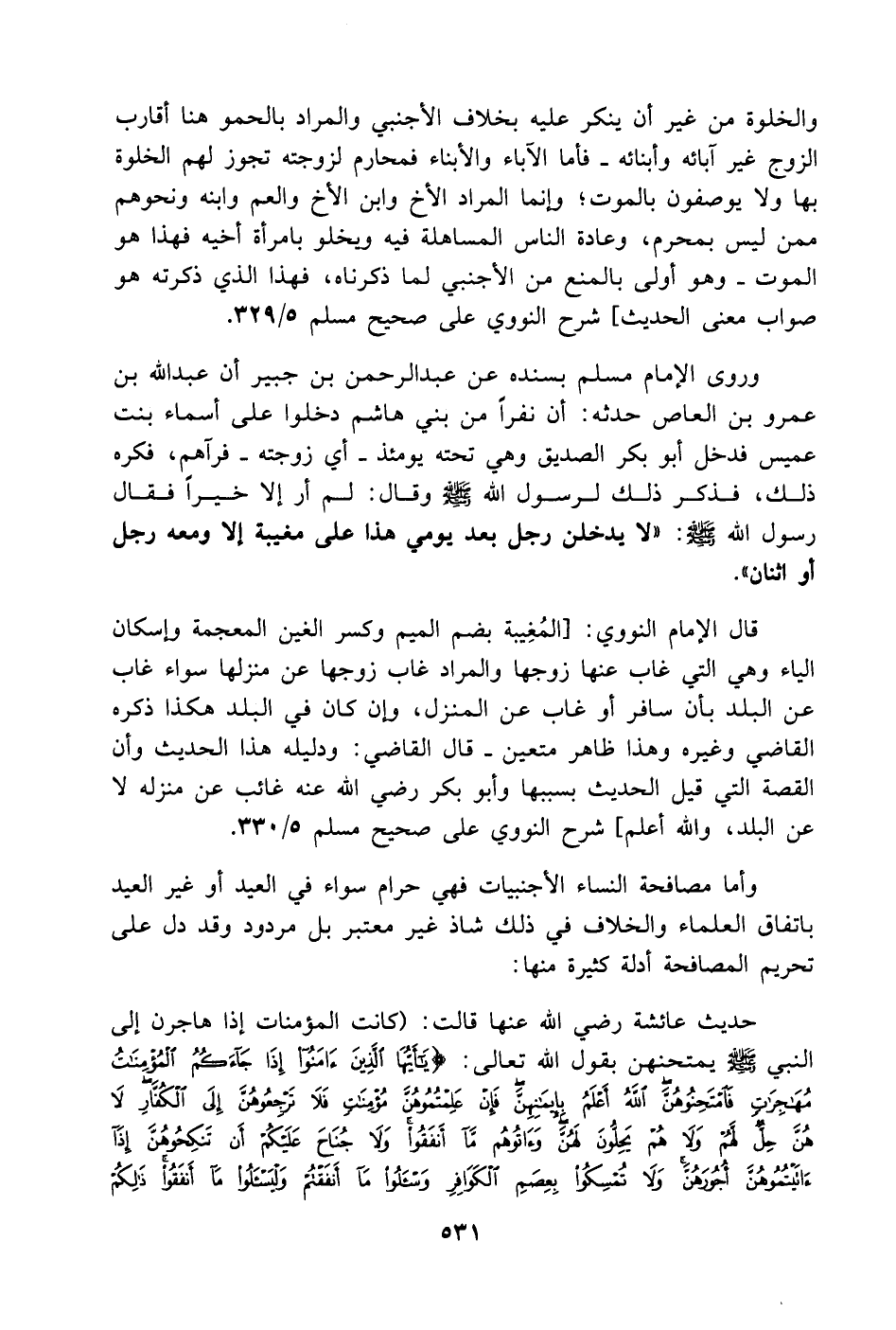 وروى الإمام مسلم بسنده عن عبد الرحمن بن جبير أن عبد الله بن عمرو بن العاص حدثه أن نفراً من بني هاشم دخلوا على أسماء بنت عميس فدخل أبو بكر الصديق وهي تحته يومئذ - أي زوجته - فرآهم فكره ذلك فذكر ذلك لرسول الله - صَلَّى اللهُ عَلَيْهِ وَسَلَّمَ - وقال: لم أر إلا خيراً فقال رسول الله - صَلَّى اللهُ عَلَيْهِ وَسَلَّمَ -: (لا يدخلن رجل بعد يومي هذا على مغيبة إلا ومعه رجل أو اثنان).