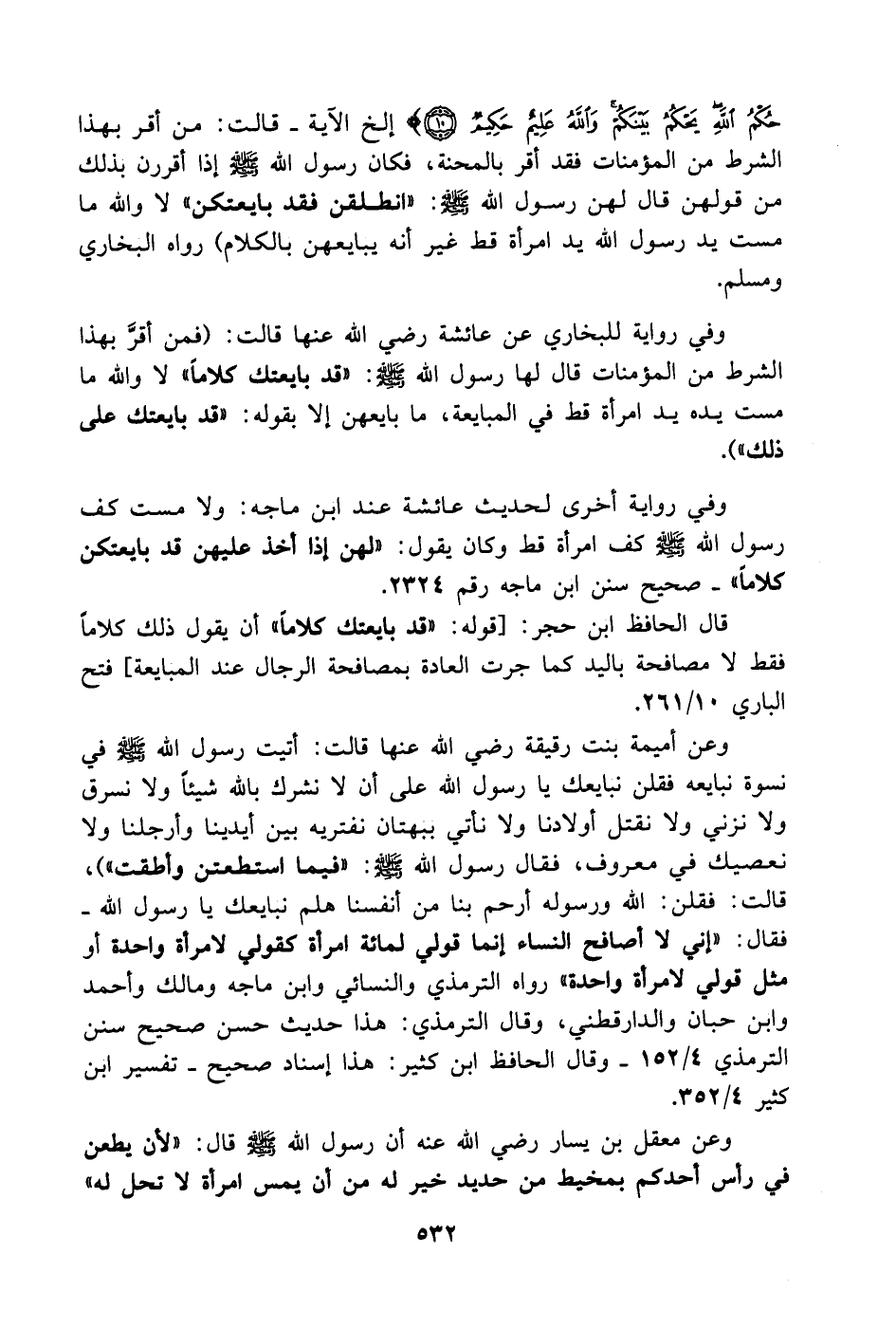 وفي رواية أخرى لحديث عائشة عند ابن ماجة: [ولا مست كف رسول الله - صَلَّى اللهُ عَلَيْهِ وَسَلَّمَ - كف امرأة قط وكان يقول لهن إذا أخذ عليهن قد بايعتكن كلاماً). صحيح سنن ابن ماجة رقم 2324.
