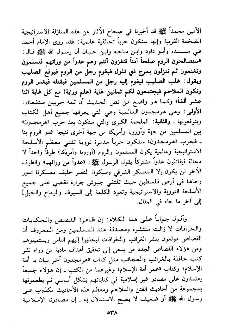 ستقعان: الأولى: وهي هرمجدون العالمية وهي التي يعرفها جميع أهل الكتاب ويتوقعونها. والثانية: الملحمة الكبرى والتي ستكون بعد حرب " هرمجدون " بين المسلمين من جهة وأوروبا وأمريكا من جهة أخرى نتيجة غدر الروم بنا. فحرب " هر مجدون " ستكون حرباً مدمرة نووية تفني معظم الأسلحة الاستراتيجية وعالمية يكون المسلمون والروم (أوروبا وأمريكا) طرفاً واحداً لا محالة فيقاتلون عدواً مشتركاً يقول الرسول - صَلَّى اللهُ عَلَيْهِ وَسَلَّمَ -: (عدواً من ورائهم) والطرف الآخر لن يكون إلا المعسكر الشرقي وسيكون النصر حليف معسكرنا تدور رحاها في أرض فلسطين حيث تلتقي جيوش جرارة تقضي على جميع الأسلحة النووية والاستراتيجية وتعود الكلمة إلى السيوف والرماح والخيل] إلى آخر ما جاء في المقال.