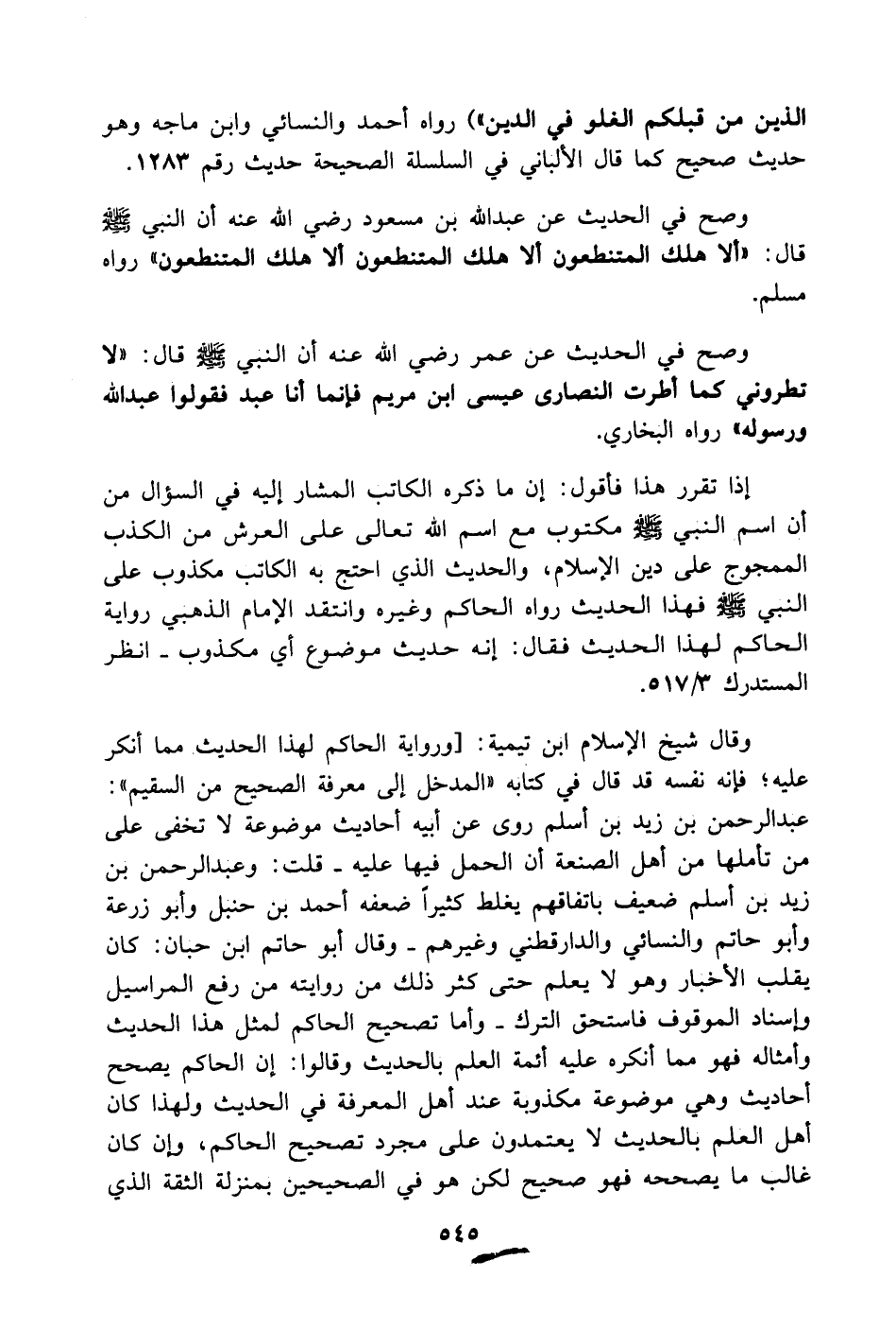 وقال شيخ الإسلام ابن تيمية: [ورواية الحاكم لهذا الحديث مما أنكر عليه فإنه نفسه قد قال في كتابه " المدخل إلى معرفة الصحيح من السقيم ": عبد الرحمن بن زيد بن أسلم روى عن أبيه أحاديث موضوعة لا تخفى على من تأملها من أهل الصنعة أن الحمل فيها عليه. قلت: وعبد الرحمن بن زيد بن أسلم ضعيف باتفاقهم يغلط كثيراً ضعفه أحمد بن حنبل وأبو زرعة وأبو حاتم والنسائي والدارقطني وغيرهم. وقال أبو حاتم ابن حبان: كان يقلب الأخبار وهو لا يعلم حتى كثر ذلك من روايته من رفع المراسيل وإسناد الموقوف فاستحق الترك. وأما تصحيح الحاكم لمثل هذا الحديث وأمثاله فهو مما أنكره عليه أئمة العلم بالحديث وقالوا: إن الحاكم يصحح أحاديث وهي موضوعة مكذوبة عند أهل المعرفة في الحديث ولهذا كان أهل العلم بالحديث لا يعتمدون على مجرد تصحيح الحاكم وإن كان غالب ما يصححه فهو صحيح لكن هو في الصحيحين بمنزلة الثقة الذي