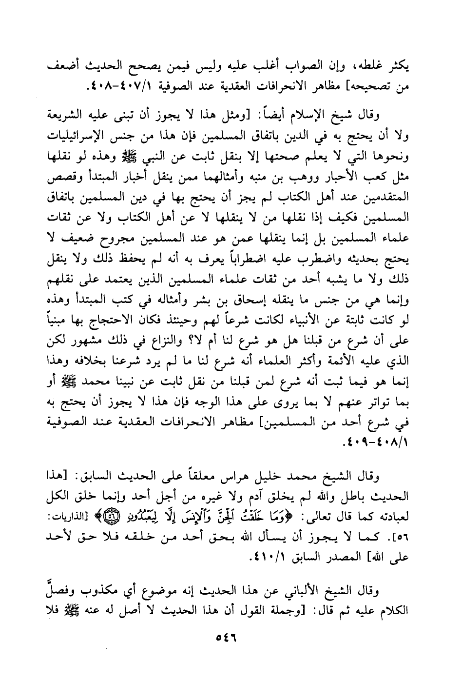 وقال شيخ الإسلام أيضاً: [ومثل هذا لا يجوز أن تبنى عليه الشريعة ولا أن يحتج به في الدين باتفاق المسلمين فإن هذا من جنس الإسرائيليات ونحوها التي لا يعلم صحتها إلا بنقل ثابت عن النبي - صَلَّى اللهُ عَلَيْهِ وَسَلَّمَ - وهذه لو نقلها مثل كعب الأحبار ووهب بن منبه وأمثالهما ممن ينقل أخبار المبتدأ وقصص المتقدمين عند أهل الكتاب لم يجز أن يحتج بها في دين المسلمين باتفاق المسلمين فكيف إذا نقلها من لا ينقلها لا عن أهل الكتاب ولا عن ثقات علماء المسلمين بل إنما ينقلها عمن هو عند المسلمين مجروح ضعيف لا يحتج بحديثه واضطرب عليه اضطراباً يعرف به أنه لم يحفظ ذلك ولا ينقل ذلك ولا ما يشبه أحد من ثقات علماء المسلمين الذين يعتمد على نقلهم وإنما هي من جنس ما ينقله إسحاق بن بشر وأمثاله في كتب المبتدأ وهذه لو كانت ثابتة عن الأنبياء لكانت شرعاً لهم وحينئذ فكان الاحتجاج بها مبنياً على أن شرع من قبلنا هل هو شرع لنا أم لا؟ والنزاع في ذلك مشهور لكن الذي عليه الأئمة وأكثر العلماء أنه شرع لنا ما لم يرد شرعنا بخلافه وهذا إنما هو فيما ثبت أنه شرع لمن قبلنا من نقل ثابت عن نبينا محمد - صَلَّى اللهُ عَلَيْهِ وَسَلَّمَ - أو بما تواتر عنهم لا بما يروى على هذا الوجه فإن هذا لا يجوز أن يحتج به في شرع أحد من المسلمين] مظاهر الانحرافات العقدية عند الصوفية 1/ 408 - 409.