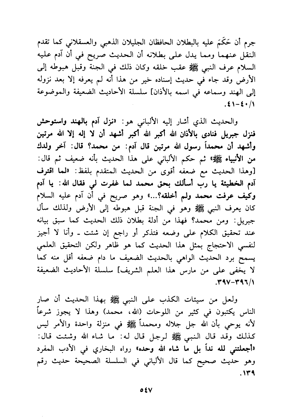 والحديث الذي أشار إليه الألباني هو: (نزل آدم بالهند واستوحش فنزل جبريل فنادى بالأذان الله أكبر الله أكبر أشهد أن لا إله إلا الله مرتين وأشهد أن محمداً رسول الله مرتين قال آدم: من محمد؟ قال: آخر ولدك من الأنبياء - صَلَّى اللهُ عَلَيْهِ وَسَلَّمَ -) ثم حكم الألباني على هذا الحديث بأنه ضعيف ثم قال: [وهذا الحديث مع ضعفه أقوى من الحديث المتقدم بلفظ: (لما اقترف آدم الخطيئة يا رب أسألك بحق محمد لما غفرت لي فقال الله: يا آدم وكيف عرفت محمد ولم أخلقه؟.) وهو صريح في أن آدم عليه السلام كان يعرف النبي - صَلَّى اللهُ عَلَيْهِ وَسَلَّمَ - وهو في الجنة قبل هبوطه إلى الأرض ولذلك سأل جبريل: ومن محمد؟ فهذا من أدلة بطلان ذلك الحديث كما سبق بيانه عند تحقيق الكلام على وضعه فتذكر أو راجع إن شئت. وأنا لا أجيز لنفسي الاحتجاج بمثل هذا الحديث كما هو ظاهر ولكن التحقيق العلمي يسمح برد الحديث الواهي بالحديث الضعيف ما دام ضعفه أقل منه كما لا يخفى على من مارس هذا العلم الشريف] سلسلة الأحاديث الضعيفة 1/ 396 - 397 .......