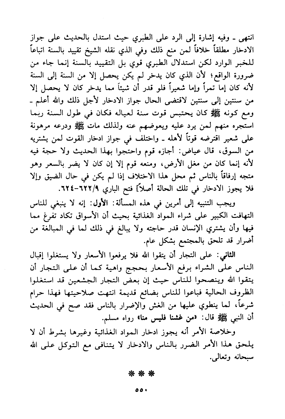 انتهى. وفيه إشارة إلى الرد على الطبري حيث استدل بالحديث على جواز الادخار مطلقاً خلافاً لمن منع ذلك وفي الذي نقله الشيخ تقييد بالسنة اتباعاً للخبر الوارد لكن استدلال الطبري قوي بل التقييد بالسنة إنما جاء من ضرورة الواقع لأن الذي كان يدخر لم يكن يحصل إلا من السنة إلى السنة لأنه كان إما تمراً وإما شعيراً فلو قدر أن شيئاًَ مما يدخر كان لا يحصل إلا من سنتين إلى سنتين لاقتضى الحال جواز الادخار لأجل ذلك والله أعلم. ومع كونه - صَلَّى اللهُ عَلَيْهِ وَسَلَّمَ - كان يحتبس قوت سنة لعياله فكان في طول السنة ربما استجره منهم لمن يرد عليه ويعوضهم عنه ولذلك مات - صَلَّى اللهُ عَلَيْهِ وَسَلَّمَ - ودرعه مرهونة على شعير اقترضه قوتاً لأهله. واختلف في جواز ادخار القوت لمن ......