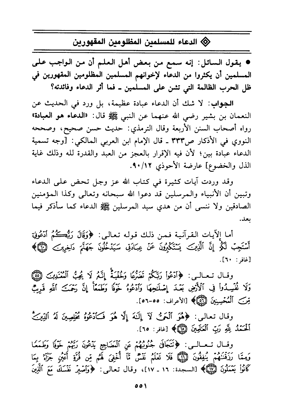 يقول السائل: إنه سمع من بعض أهل العلم أن من الواجب على المسلمين أن يكثروا من الدعاء لإخوانهم المسلمين المظلومين المقهورين في ظل الحرب الظالمة التي تشن على المسلمين. فما أثر الدعاء وفائدته؟