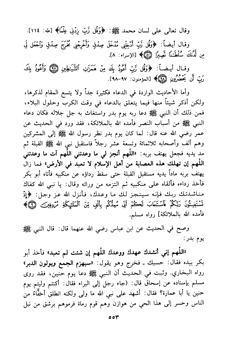 وأما الأحاديث الواردة في الدعاء فكثيرة جداً ولا يتسع المقام لذكرها ولكن أذكر شيئاً منها فيما يتعلق بالدعاء في وقت الكرب وحلول البلاء فمن ذلك أن النبي - صَلَّى اللهُ عَلَيْهِ وَسَلَّمَ - دعا ربه يوم بدر واستغاث به جل جلاله فكان دعاء النبي - صَلَّى اللهُ عَلَيْهِ وَسَلَّمَ - من أسباب النصر فأمده الله بالملائكة فقد ورد في الحديث عن عمر - رضي الله عنه - قال: لما كان يوم بدر نظر رسول الله - صَلَّى اللهُ عَلَيْهِ وَسَلَّمَ - إلى المشركين وهم ألف وأصحابه ثلاثمائة وتسعة عشر رجلاً فاستقبل نبي الله - صَلَّى اللهُ عَلَيْهِ وَسَلَّمَ - القبلة ثم مد يديه فجعل يهتف بربه: (اللهم أنجز لي ما وعدتني اللهم آت ما وعدتني اللهم إن تهلك هذه العصابة من أهل الإسلام لا تعبد في الأرض) فما زال يهتف بربه ماداً يديه مستقبل القبلة حتى سقط رداؤه عن منكبيه فأتاه أبو بكر فأخذ رداءه فألقاه على منكبيه ثم التزمه من ورائه وقال: يا نبي الله كفاك مناشدتك ربك فإنه سينجز لك ما وعدك فأنزل الله عز وجل: (إِذْ تَسْتَغِيثُونَ رَبَّكُمْ فَاسْتَجَابَ لَكُمْ أَنِّي مُمِدُّكُمْ بِأَلْفٍ مِنَ الْمَلَائِكَةِ مُرْدِفِينَ) فأمده الله بالملائكة] رواه مسلم.