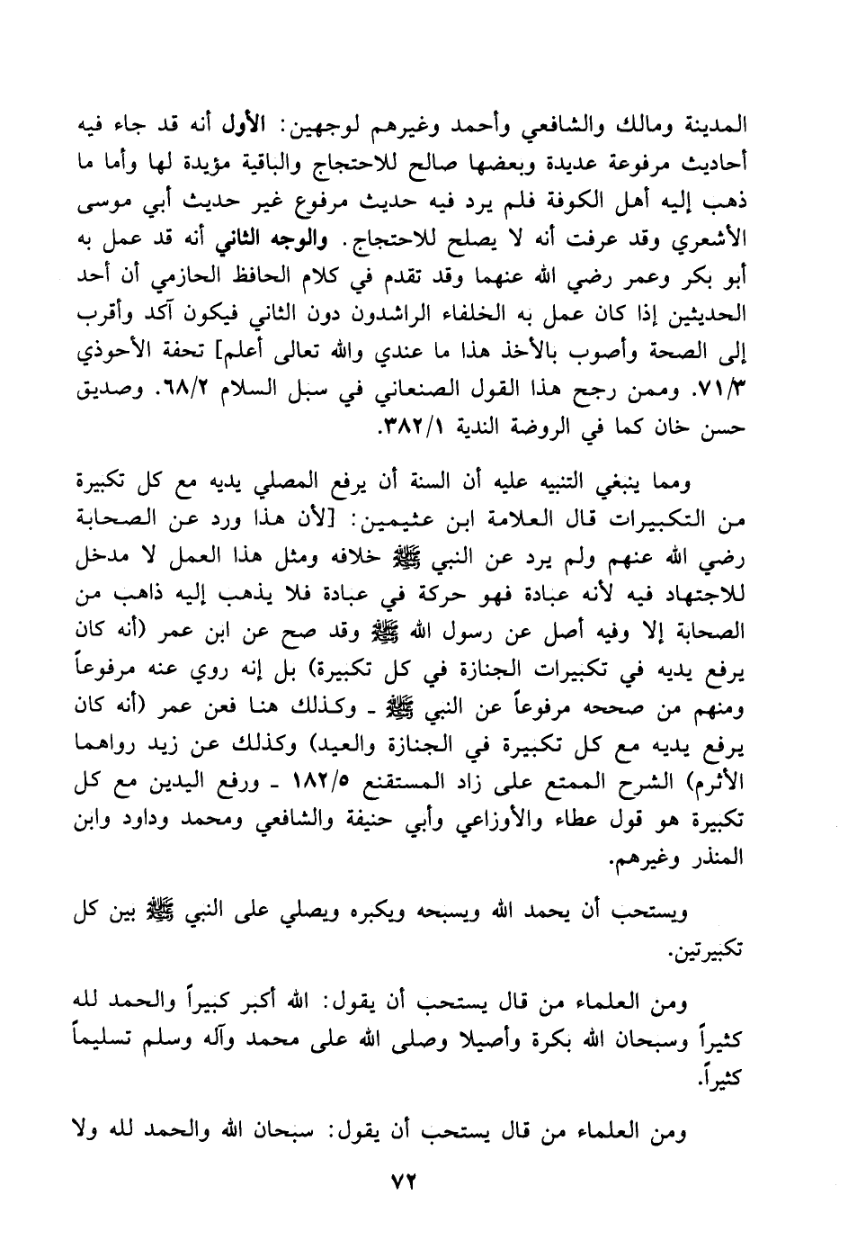 المدينة ومالك والشافعي وأحمد وغيرهم لوجهين: الأول أنه قد جاء فيه أحاديث مرفوعة عديدة وبعضها صالح للاحتجاج والباقية مؤيدة لها وأما ما ذهب إليه أهل الكوفة فلم يرد فيه حديث مرفوع غير حديث أبي موسى الأشعري وقد عرفت أنه لا يصلح للاحتجاج. والوجه الثاني أنه قد عمل به أبو بكر وعمر رضي الله عنهما وقد تقدم في كلام الحافظ الحازمي أن أحد الحديثين إذا كان عمل به الخلفاء الراشدون دون الثاني فيكون آكد وأقرب إلى الصحة وأصوب بالأخذ هذا ما عندي والله تعالى أعلم] تحفة الأحوذي 3/ 71. وممن رجح هذا القول الصنعاني في سبل السلام 2/ 68. وصديق حسن خان كما في الروضة الندية 1/ 382.