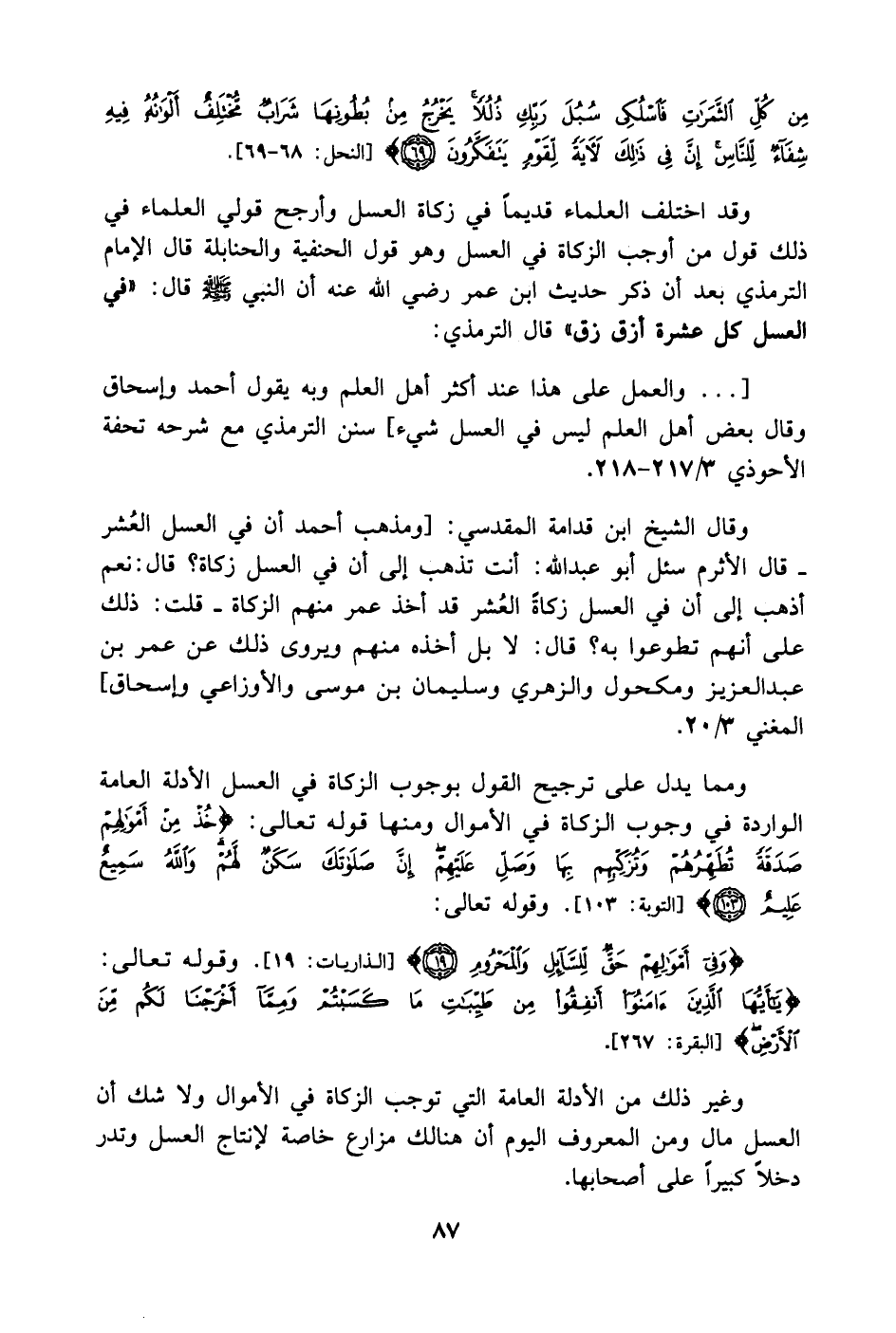 وقد اختلف العلماء قديماً في زكاة العسل وأرجح قولي العلماء في ذلك قول من أوجب الزكاة في العسل وهو قول الحنفية والحنابلة قال الإمام الترمذي بعد أن ذكر حديث ابن عمر - رضي الله عنه - أن النبي - صَلَّى اللهُ عَلَيْهِ وَسَلَّمَ - قال: (في العسل كل عشرة أزق زق) قال الترمذي: [والعمل على هذا عند أكثر أهل العلم وبه يقول أحمد واسحق وقال بعض أهل العلم ليس في العسل شيء] سنن الترمذي مع شرحه تحفة الأحوذي 3/ 217 - 218.