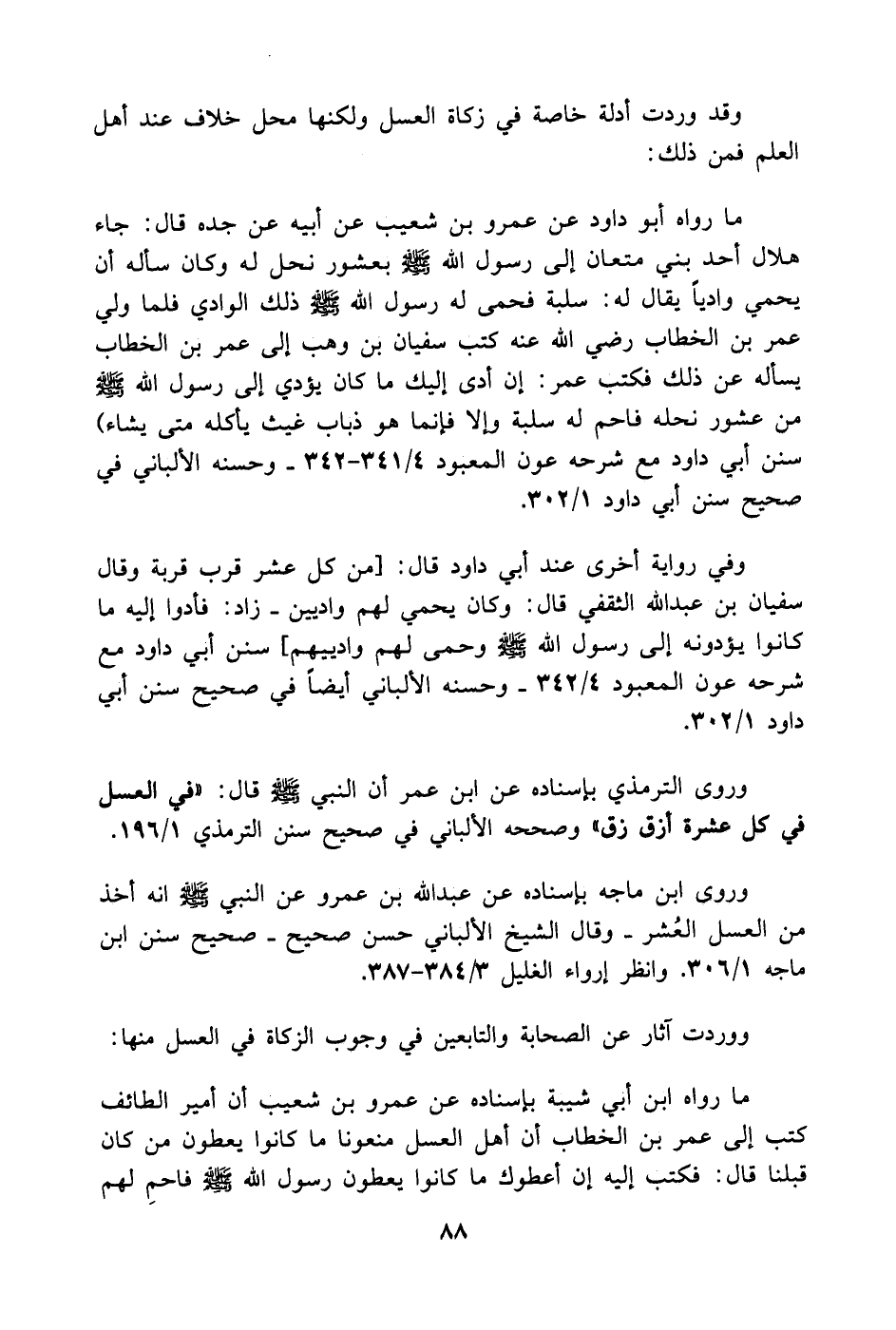 مارواه أبو داود عن عمرو بن شعيب عن أبيه عن جده قال: جاء هلال أحد بني متعان إلى رسول الله - صَلَّى اللهُ عَلَيْهِ وَسَلَّمَ - بعشور نحل له وكان سأله أن يحمي وادياً يقال له سلبة فحمى له رسول الله - صَلَّى اللهُ عَلَيْهِ وَسَلَّمَ - ذلك الوادي فلما ولي عمر بن الخطاب - رضي الله عنه - كتب سفيان بن وهب إلى عمر بن الخطاب يسأله عن ذلك فكتب عمر: إن أدى إليك ما كان يؤدي إلى رسول الله - صَلَّى اللهُ عَلَيْهِ وَسَلَّمَ - من عشور نحله فاحم له سلبة وإلا فإنما هو ذباب غيث يأكله متى يشاء) سنن أبي داود مع شرحه عون المعبود 4/ 341 - 342. وحسنه الألباني في صحيح سنن أبي داود 1/ 302.