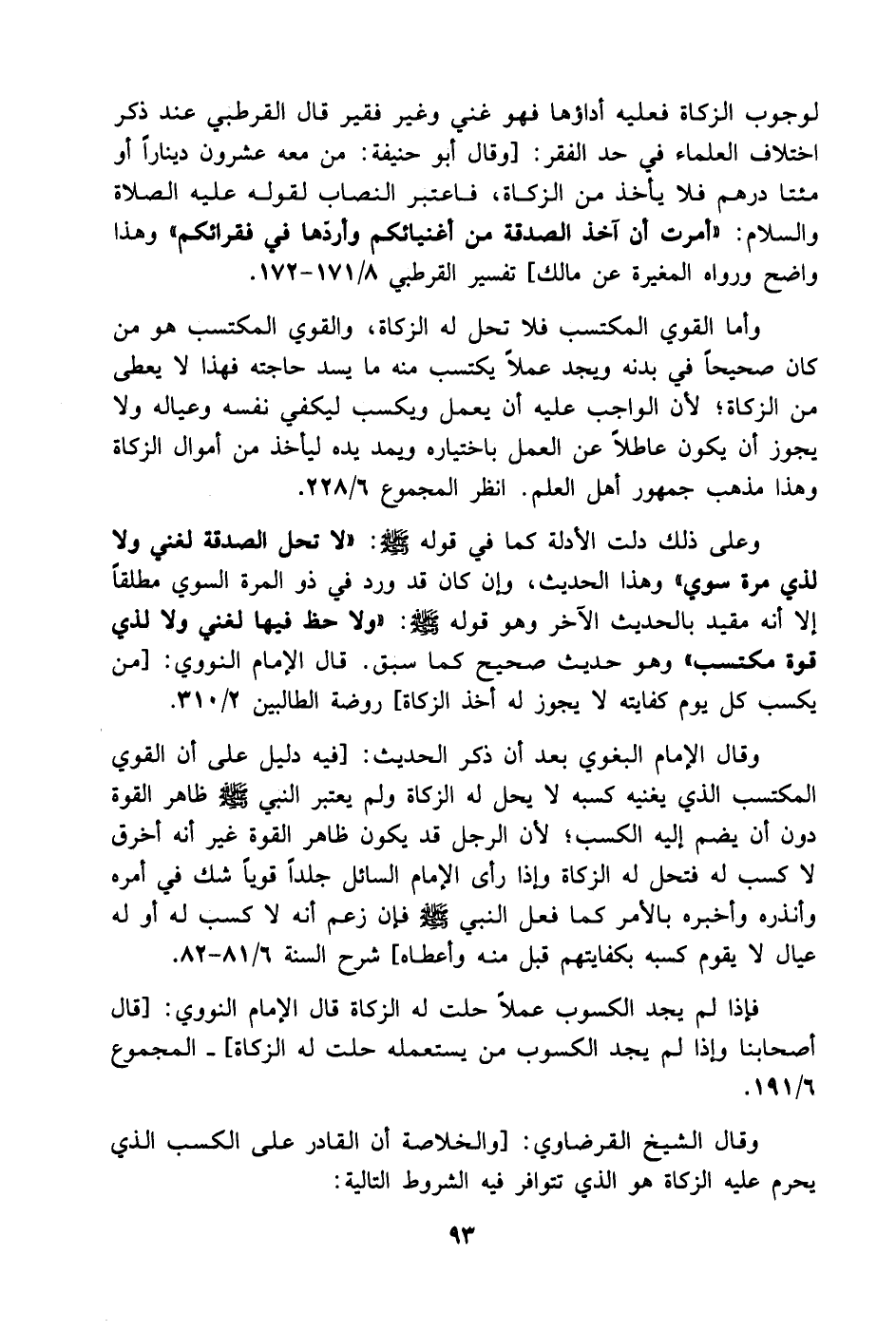 وقال الشيخ القرضاوي: [والخلاصة أن القادر على الكسب الذي يحرم عليه الزكاة هو الذي تتوافر فيه الشروط التالية: