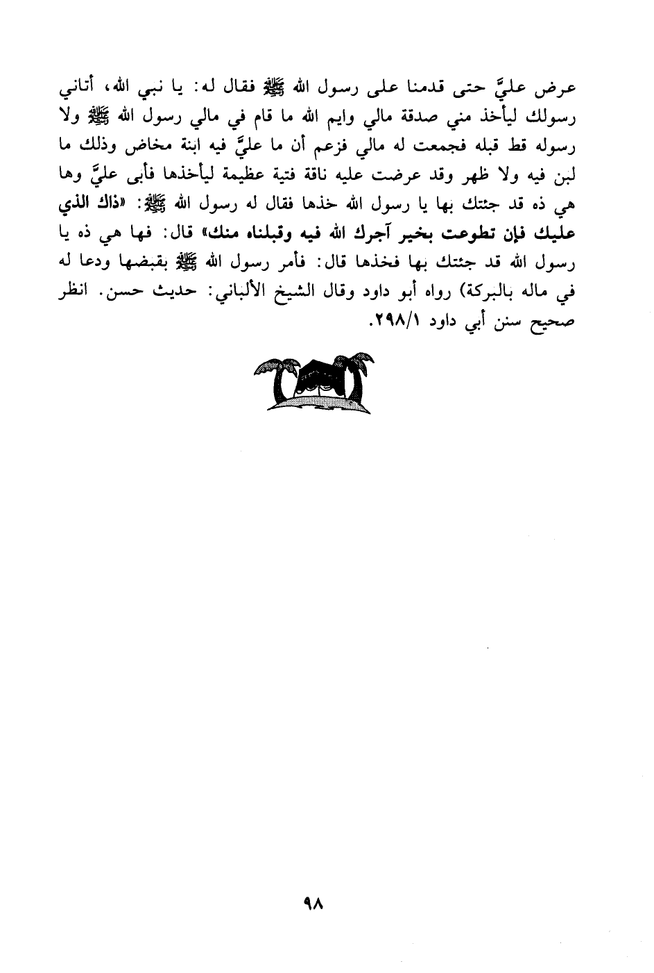 عرض عليَّ حتى قدمنا على رسول الله - صَلَّى اللهُ عَلَيْهِ وَسَلَّمَ -فقال له: يا نبي الله أتاني رسولك ليأخذ مني صدقة مالي وأيم الله ما قام في مالي رسول الله - صَلَّى اللهُ عَلَيْهِ وَسَلَّمَ - ولا رسوله قط قبله فجمعت له مالي فزعم أن ما عليَّ فيه ابنة مخاض وذلك ما لبن فيه ولا ظهر وقد عرضت عليه ناقة فتية عظيمة ليأخذها فأبى عليَّ وها هي ذه قد جئتك بها يا رسول الله خذها فقال له رسول الله - صَلَّى اللهُ عَلَيْهِ وَسَلَّمَ -: ذاك الذي عليك فإن تطوعت بخير آجرك الله فيه وقبلناه منك. قال: فها هي ذه يا رسول الله قد جئتك بها فخذها قال: فأمر رسول الله - صَلَّى اللهُ عَلَيْهِ وَسَلَّمَ - بقبضها ودعا له في ماله بالبركة) رواه أبو داود وقال الشيخ الألباني حديث حسن انظر صحيح سنن أبي داود 1/ 298.