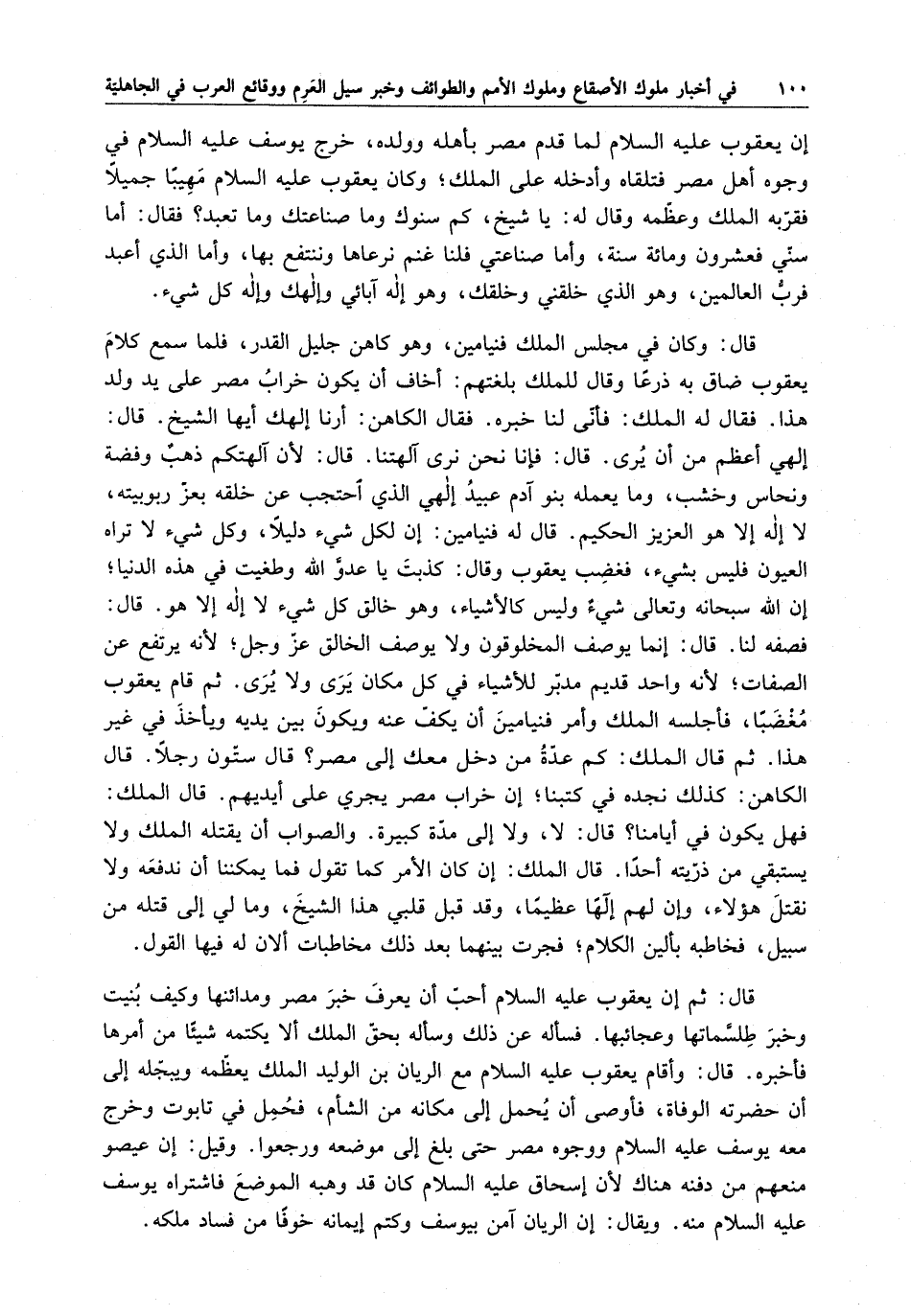 قال : وكان في مجلس فنيامين ، وهو كاهن جليل القدر ، فلما سمع كلام يعقوب ضاق به ذرعاً وقال للملك بلغتهم : أخاف أن يكون خراب مصر على يد ولد هذا . فقال له الملك : فأني لنا خبرة ، فقال الكاهن : أرنا إلهك أيها الشيخ . قال : إلهي أعظم من أن يرى . قال : فإنا نحن نرى آلهتنا . قال : لأن آلهتكم ذهب وفضة ونحاس وخشب ، وما يعمله بنو آدم عبيد إلهي الذي احتجب عن خلقه بعز ربوبيته ، لا إله إلا هو العزيز الحكيم . قال له فنيامين : إن لكل شيء دليلاً ، وكل شيء لا تراه العيون فليس بشيء ، فغضب يعقوب وقال : كذبت يا عدو الله وطغيت في هذه الدنيا ؛ إن الله سبحانه وتعالى شيء وليس كالأشياء ، وهو خالق كل شيء لا إله إلا هو . قال : فصفه لنا . قال : إنما يوصف المخلوقون ولا يوصف الخالق عز وجل ؛ لأنه يرتفع عن الصفات ؛ لأنه واحد ثديم مدبر للأشياء في كل مكان يرى ولا يرى . ثم قام يعقوب مغضباً ، فأجلسه الملك وأمر فنيامين أن يكف عنه ويكون بين يديه ، ويأخذ في غير هذا . ثم قال الملك : كم عدة من دخل معك إلى مصر ؟ قال ستون رجلاً . قال الكاهن : كذلك نجده في كتبنا ؛ إن خراب مصر يجري على أيديهم . قال الملك : فهل يكون في أيامنا ؟ قال : لا ، ولا إلى مدة كبيرة . والصواب أن يقتله الملك ولا يستبقي من ذريته أحداً . قال الملك : إن كان الأمر كما تقول فما يمكننا أن ندفعه ولا نقتل هؤلاء ، وإن لهم إلهاً عظيماً ، وقد قبل قلبي هذا الشيخ ، ومالي إلى قتله من سبيل ، فخاطبه بألين الكلام ؛ فجرت بينهما بعد ذلك مخاطبات ألان له فيها القول .
