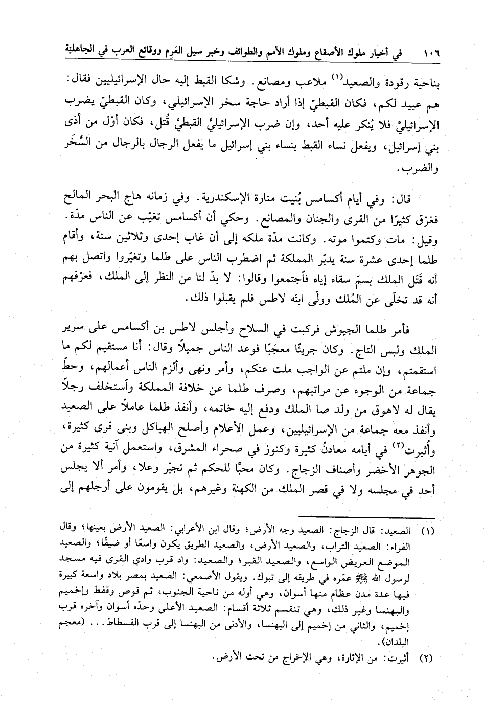 قال : وفي أيام اكسامس بنيت منارة الإسكندرية . وفي زمانه هاج البحر المالح فغرق كثيراً من القرى والجنان والمصانع . وحكى أن أكسامس تغيب عن الناس مدة . وقيل : مات وكتموا موته . وكانت مدة ملكه إلى أن غاب إحدى وثلاثين سنة ، وأقام طلما إحدى عشرة سنة يدبر المملكة ثم اضطرب الناس على طلما وتغيروا واتصل بهم أنه قتل الملك بسم سقاه إياه فاجتمعوا وقالوا : لا بد لنا من النظر إلى الملك ، فعرفهم أنه قد تخلى عن الملك وولى ابنه لاطس فلم يقبلوا ذلك .