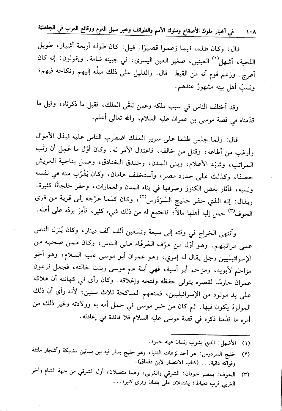 قال : ولما جلس طلما على سرير الملك اضطرب الناس عليه فبذل الأموال وأرغب من أطاعه ، وقتل من خالفه ، فاعتدل الأمر له . وكان أول ما عمل أن رتب المراتب ، وشيد الأعلام ، ونى المدن ، وخندق الخنادق ، وعمل بناحية العريش حصناً ، وكذلك على حدود مصر ، واستخلف هامان ، وكان يقرب منه في نفسه ونسبه ، فأثار بعض الكنوز وصرفها في بناء المدن والعمارات ، وحفر خلجاناً كثيرة . ويقال : إنه الذي حفر خليج السردوس ، وكان كلما عرجه إلى قرية من قرى الحوف حمل إليه أهلها مالاً ؛ فاجتمع له من ذلك شيء كثير ، فأمر برده على أهله .