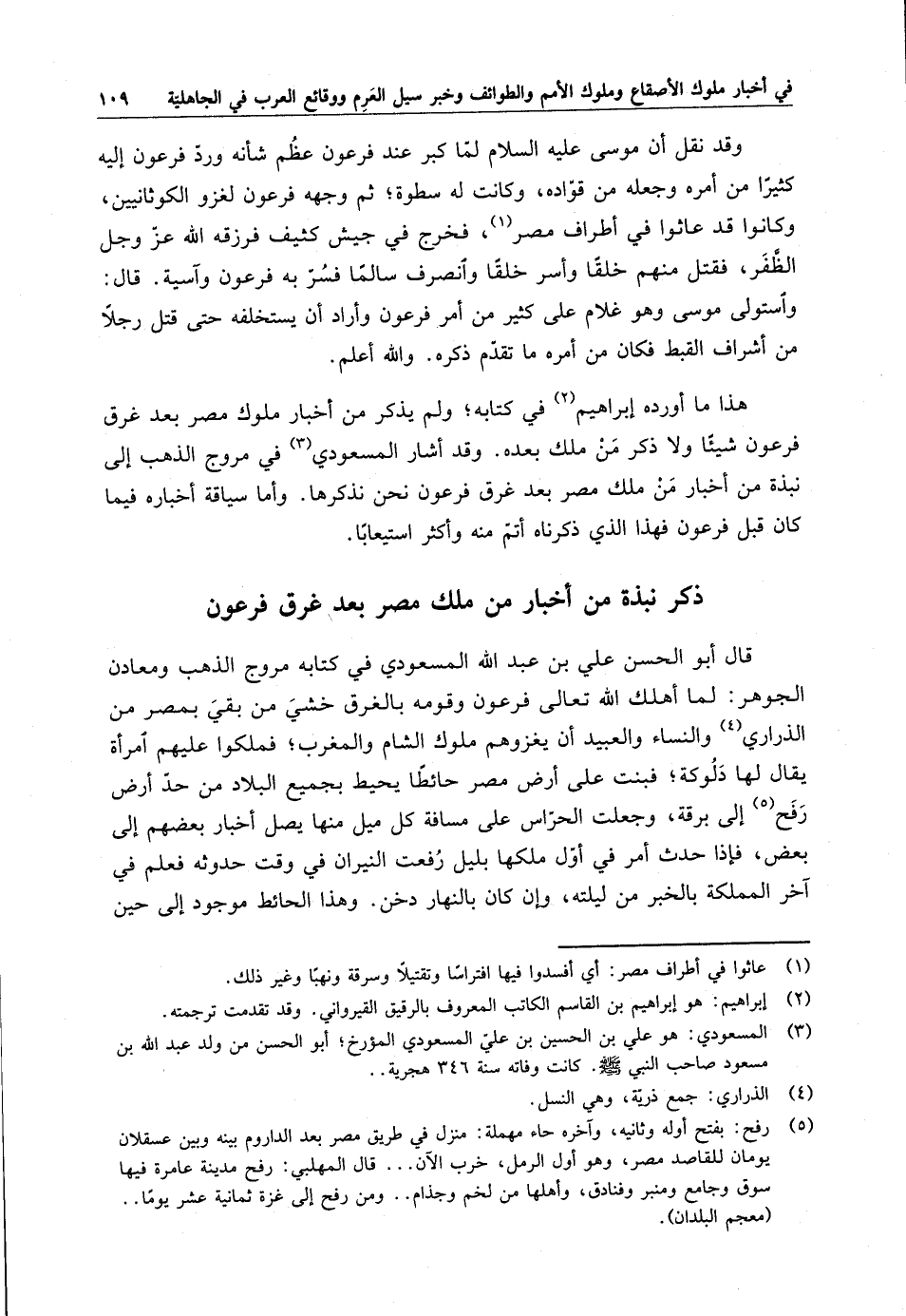 هذا ما أورده إبراهيم في كتابه ولم يذكر من أخبار ملوك مصر بعد غرق فرعون شيئاً ولا ذكر من ملك بعده . وقد أشار المسعودي في مروج الذهب إلى نبذة من أخبار من ملك مصر بعد غرق فرعون نحن نذكرها . وأما سياقه أخباره فيما كان قبل فرعون فهذا الذي ذكرناه أتم منه وأكثر استيعاباً .