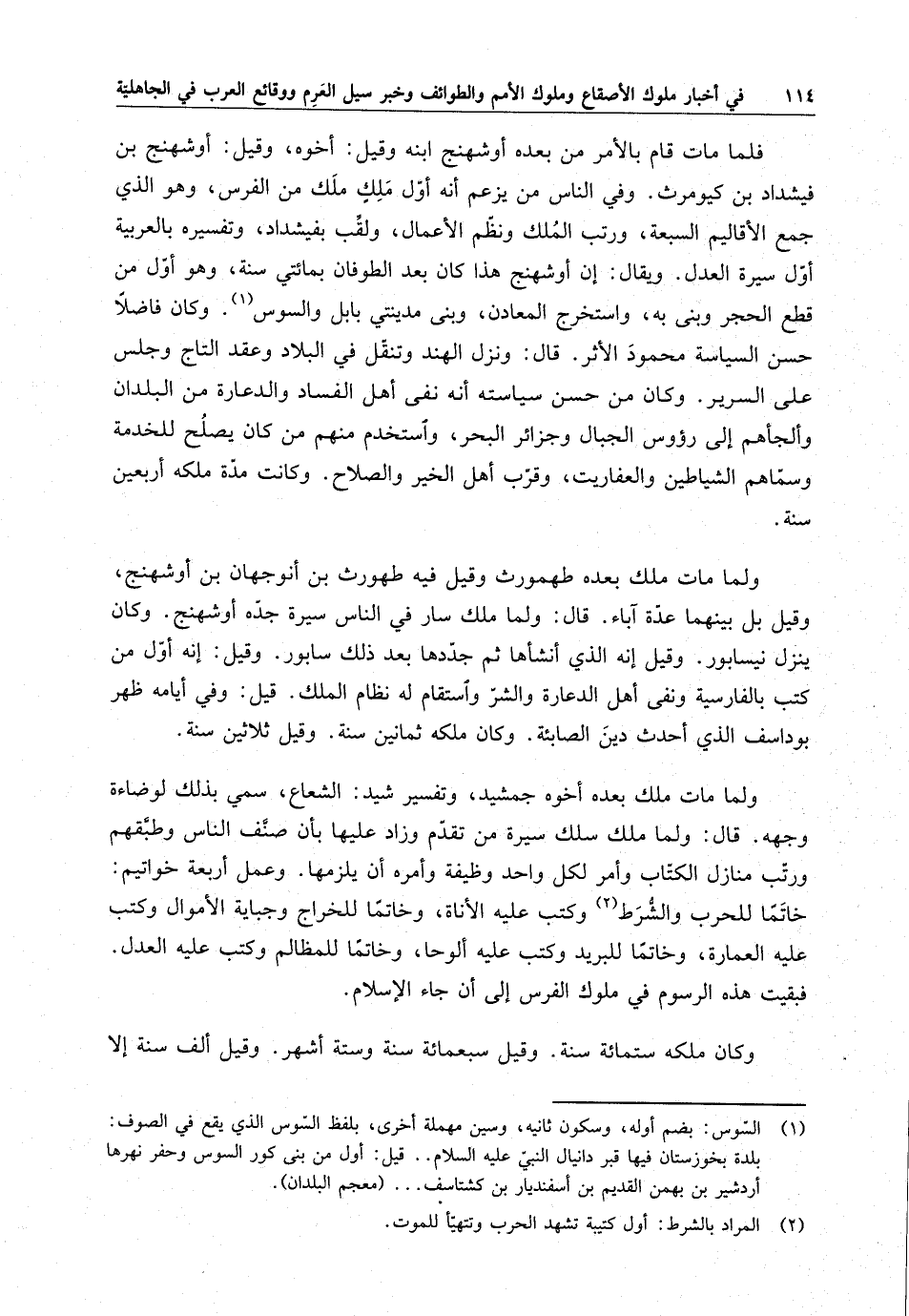 فلما مات قام بالأمر من بعده أوشهنج ابنه وقيل : أخوه ، وقيل : أوشهنج ابن قيشداد بن كيومرث . وفي الناس من يزعم أنه أول ملك ملك من الفرس ، وهو الذي جمع الأقاليم السبعة ، ورتب الملك ونظم الأعمال ، ولقب بقيشداد ، وتفسيره بالعربية أول سيرة العدل . ويقال : إن أوشهنج هذا كان بعد الطوفان بمائتي سنة ، وهو أول من قطع الحجر وبنى به ، واستخرج المعادن ، وبنى مدينتي بابل والسوس .