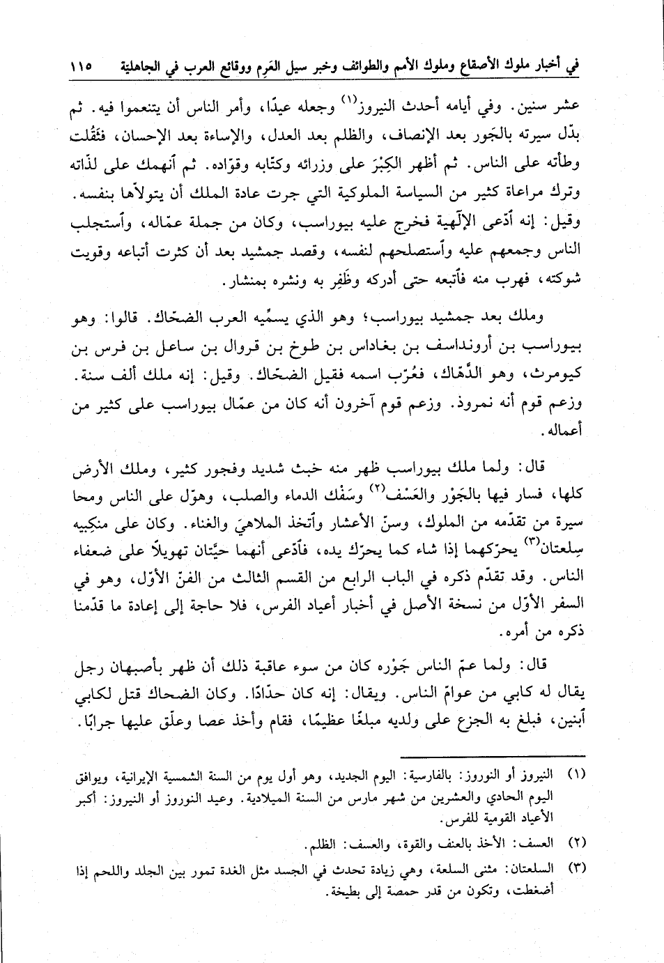 قال : ولما ملك بيوراسب ظهر منه خبث شديد ، وفجور كثير ، وملك الأرض كلها ، فسار فيها بالجور والعسف وسفك الدماء والصلب ، وهول على الناس ومحا سيرة من تقدمه من الملوك ، وسن الأعشار ، واتخذ المالهي والغناء . وكان على منكبيه سلعتان يحركهما إذا شاء كما يحرك يده ، فادعى أنهما حيتان تهويلاً على ضعفاء الناس . وقد تقدم ذكره في الباب الرابع من القسم الثالث من الفن الأول ، وهو في السفر الأول من نسخة الأصل في أخبار أعياد الفرس ، فلا حاجة إلى إعادة ما قدمنا ذكره من أمره .