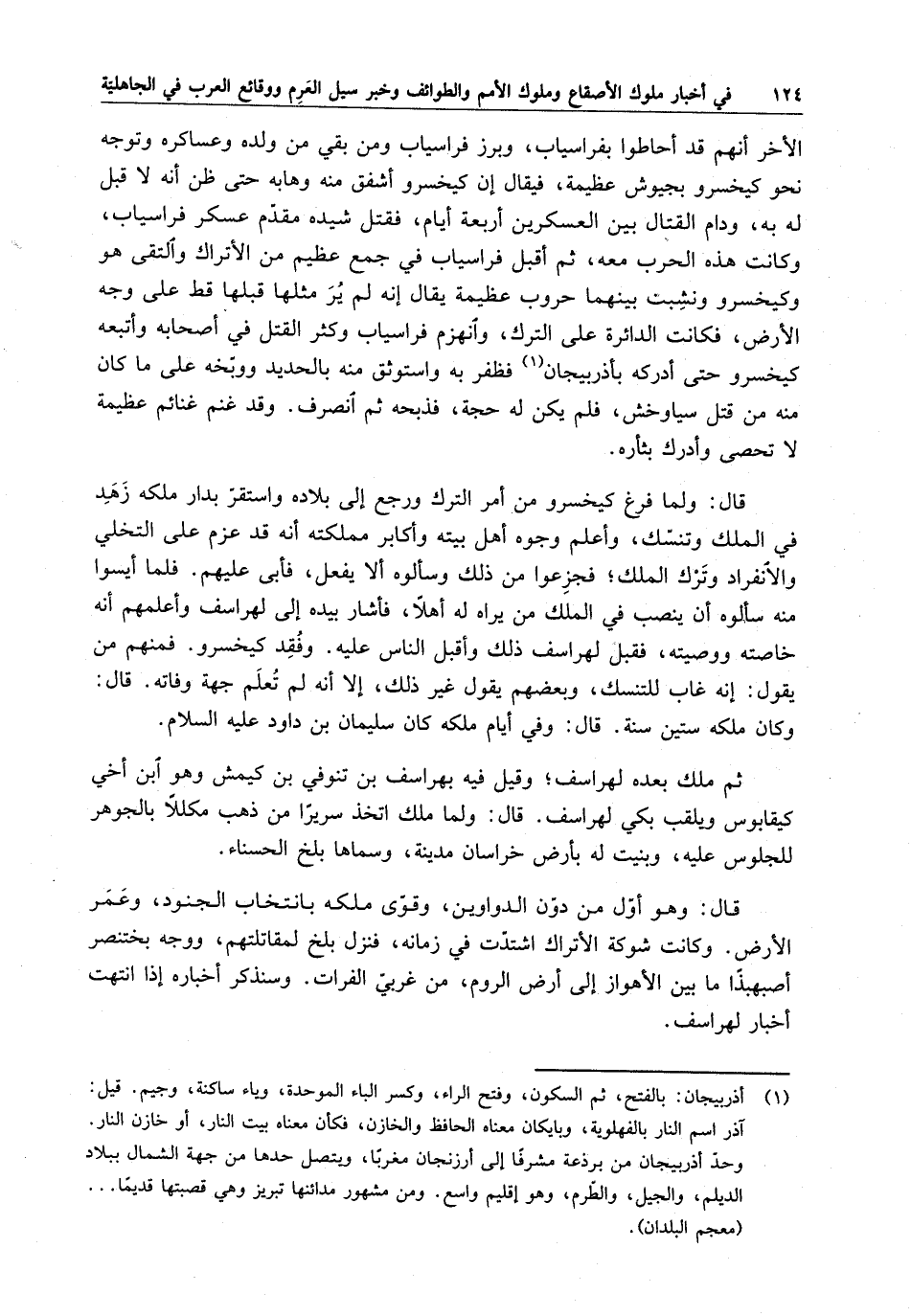 الأخر أنهم قد أحاطوا بفراسياب ، وبرز فراسياب ومن بقي من ولده وعساكره وتوجه نحو كيخسرو بجيوش عظيمة ، فيقال إن كيخسرو أشفق منه وهابه حتى ظن أنه لا قبل له به ، ودام القتال بين العسكرين أربعة أيام ، فقتل شيده مقدم عسكر فراسياب ، وكانت هذه الحرب معه ، ثم أقبل فراسياب في جمع عظيم من الأتراك والتقى هو وكيخسرو ونشبت بينهما حروب عظيمة يقال إنه لم ير مثلها قبلها قط على وجه الأرض ، فكانت الدائرة على الترك ، وانهزم فراسياب وكثر القتل في أصحابه وأتبعه كيخسرو حتى أدركه بأذربيجان فظفر به واستوثق منه بالحديد ووبخه على ما كان منه من قتل سياوخش ، فلم يكن له حجة ، فذبحه ثم انصرف . وقد غنم غنائم عظيمة لا تحصى وأدرك بثأره .