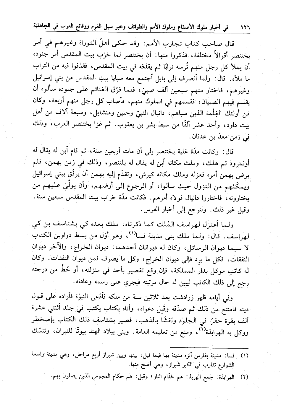ولما اعتزل لهراسف الملك كما ذكرناه ملك بعده كي بشتاسف بن كي لهراسف . قال : ولما ملك بنى مدينة فسا ، وهو أول من بسط دواوين الكتاب لا سيما ديوان الرسائل . وكان له ديوانان أحدهما : ديوان الخراج ، والآخر ديوان النفقات ، فكل ما يرد فإلى ديوان الخراج ، وكل ما يصرف فمن ديوان النفقات . وكان له كاتب موكل بدار المملكة ، فإن وقع تقصير بأحد في منزلته ، أو حط من ردجته رجع إلى ذلك الكاتب ليبين له حال مرتبته فيجري على رسمه وعادته .