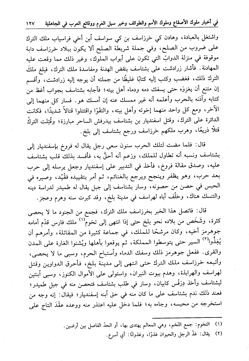 واشتغل بالعبادة ، وهادن كي خرزاسف بن كي سواسف ابن أخي فراسياب ملك الترك على ضروب من الصلح ، وفي جملة شريطة الصلح ألا يكون ببلاد خرزاسف دابة موقوفة في منزلة الدواب التي تكون على أبواب الملوك ، وغير ذلك مما وقعت عليه المهادنة . فأشار زرادشت على بشتاسف بنقض الهدنة ومفاسدة ملك الترك ، فبلغ ملك الترك ذلك ، فغضب وكتب إليه كتاباً غليظاً من جملته أن يوجه إليه زرادشت ، وأقسم إن امتنع أن يغزوه حتى يسفك دمه ودماء أهل بيته ؛ فأجابه بشتاسف بجواب أغلظ من كتابه وآذنه بالحرب وأعلمه أنه غير ممسك عنه إن أمسك هو . فسار كل منهما إلى الآخر ، ومع كل واحد منهما إخوته وأهل بيته ، والتقوا واقتتلوا قتالاً شديداً ، فكانت الدائرة على الترك ، وقتل اسفنديار بن بشتاسف بيدرفش الساحر مبارزة ؛ وقتلت الترك قتلاً ذريعاً ، وهرب ملكهم خرزاسف ورجع بشتاسف إلى بلخ . قال : فلما مضت لتلك الحرب سنون سعى رجل يقال فروخ بإسفنديار إلى بشتاسف ونسبه أنه تطاول للملك ، وزعم أنه أحق به ، فأفسد بذلك قلب بشتاسف عليه ، وصدق مقالة فروخ ، فأخذ في التدبير على إسفنديار وجعل يرسله إلى حرب بعد حرب ، وهو يظفر وينجح ويرجع بالغنائم ، ثم أمر بتقييده فقيد ، وصيره في الحبس في حصن من حصونه ، وسار بشتاسف إلى جبل يقال له طميدر لدراسة دينه والتنسك هناك ، وخلف أباه لهراسف في مدينة بلخ ، وقد كبرت سنة وهرم وعجز .
