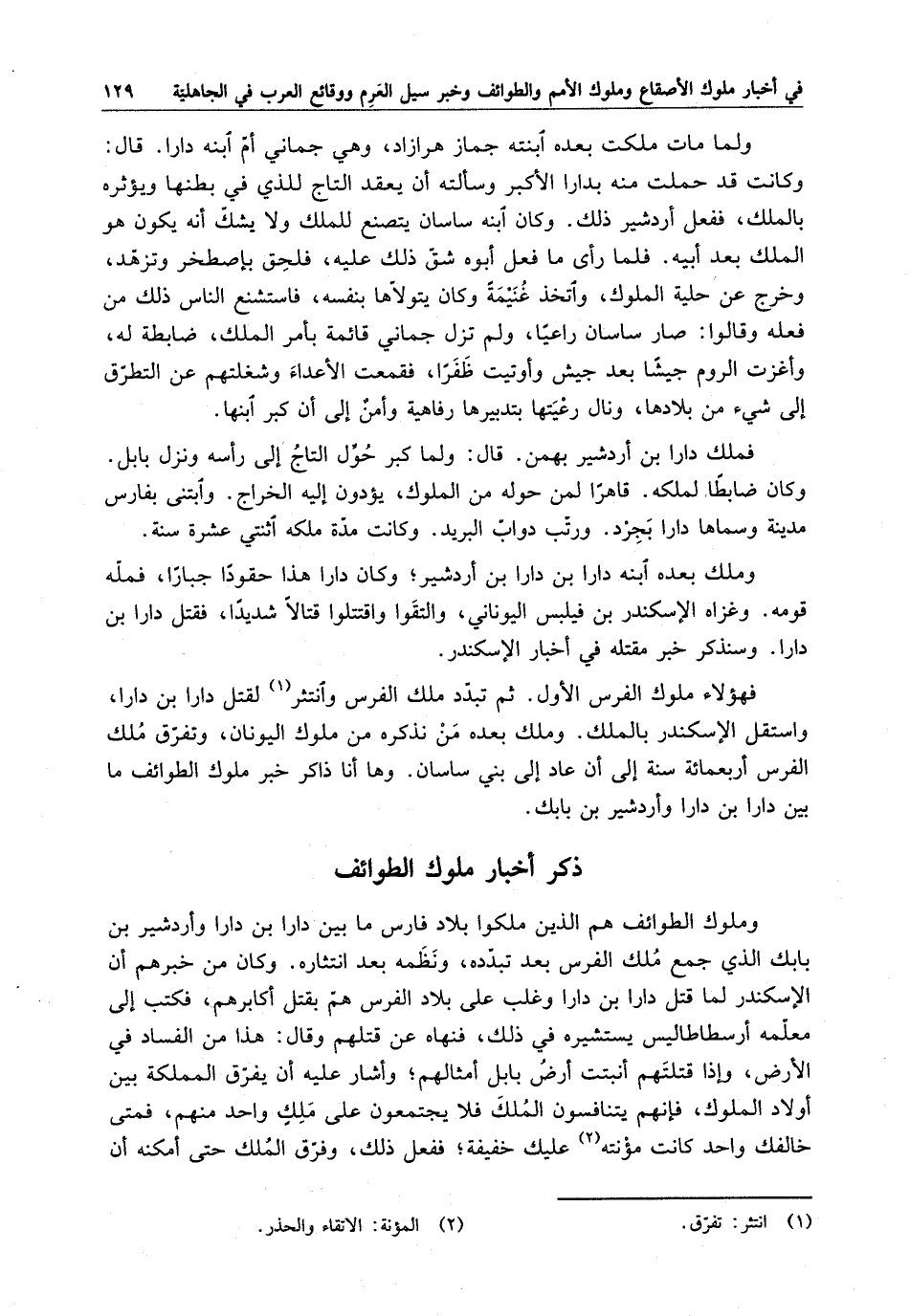 وملوك الطوائف هم الذين ملكوا بلاد فارس ما بين دارا بن دارا وأردشير ابن بابك الذي جمع ملك الفرس بعد تبدده ، ونظمه بعد انتثاره . وكان من خبرهم أن الإسكندر لما قتل دارا بن دارا وغلب على بلاد الفرس هم بقتل أكابرهم ، فكتب إلى معلمه أرسطاطاليس يستشيره في ذلك ، فنهاه عن قتلهم وقال : هذا من الفساد في الأرض ، وإذا قتلتهم أنبتت أرض بابل أمثالهم ؛ وأشار عليه أن يفرق المملكة بين أولاد الملوك ، فإنهم يتنافسون الملك فلا يجتمعون على ملك واحد منهم ، فمتى خالفك واحد كانت مؤنته عليك خفيفة ؛ ففعل ذلك ، وفرق الملك حتى أمكنه أن