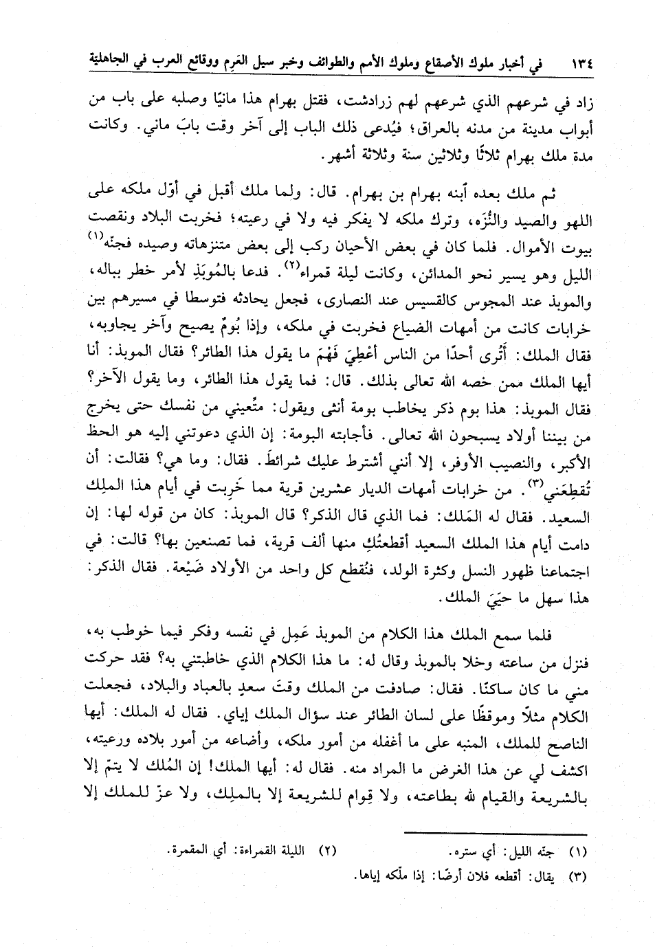 ثم ملك بعده ابنه بهرام بن بهرام . قال : ولما ملك أقبل في أول ملكه على اللهو والصيد والنزه ، وترك ملكه لا يفكر فيه ولا في رعيته ، فخربت البلاد ونقصت بيوت الأموال . فلما كان في بعض الأحيان ركب إلى بعض متنزهاته وصيده فجنه الليل وهو يسير نحو المدائن ، وكانت ليلة قمراء . فدعا بالموبذ لأمر خطر بباله ، والموبذ عند المجوس كالقسيس عند النصارى ، فجعل يحادثه فتوسطا في مسيرهم بين خرابات كانت من أمهات الضياع فخربت في ملكه ، وإذا بوم يصيح وآخر يجاوبه ، فقال الملك : أترى أحداً من الناس أعطي فهم ما يقول هذا الطائر ؟ فقال الموبذ : أنا أيها الملك ممن خصه الله تعالى بذلك . قال : فما يقول هذا الطائر ، وما يقول الآخر ؟ فقال الموبذ : هذا بوم ذكر يخاطب بومة أنثى ويقول : متعيني من نفسك حتى يخرج من بيننا أولاد يسبحون الله تعالى . فأجابته البومة : إن الذي دعوتني إليه هو الحظ الأكبر ، والنصيب الأوفر ، إلا أنني أشترط عليك شرائط . فقال : وما هي ؟ فقالت : أن تقطعني من خرابات أمهات الديار عشرين قرية مما خربت في أيام هذا الملك السعيد . فقال له الملك : فما الذي قال الذكر ؟ قال الموبذ : كان من قوله لها : إن دامت أيام هذا الملك السعيد أقطعتك منها ألف قرية ، فما تصنعين بها ؟ قالت : في اجتماعنا ظهور النسل وكثرة الولد ، فنقطع كل واحد من الأولاد ضيعة . فقال الذكر : هذا سهل ما حيي الملك .