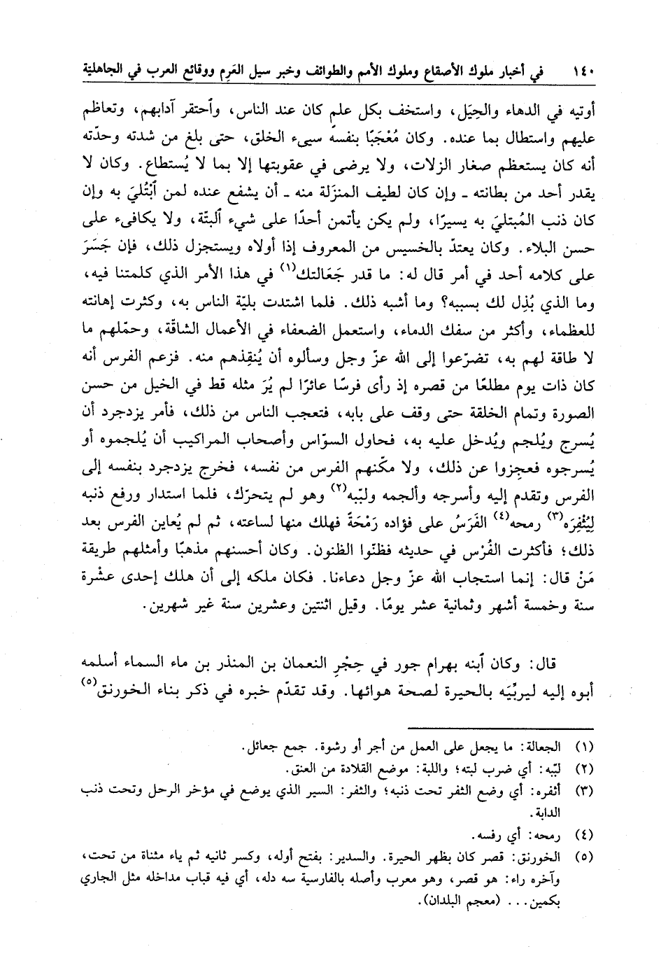 قال : وكان ابنه بهرام جور في حجر النعمان بن المنذر بن ماء السماء أسلمه أبوه إليه ليربيه بالحيرة لصحة هوائها . وقد تقدم خبره في ذكر بناء الخورنق